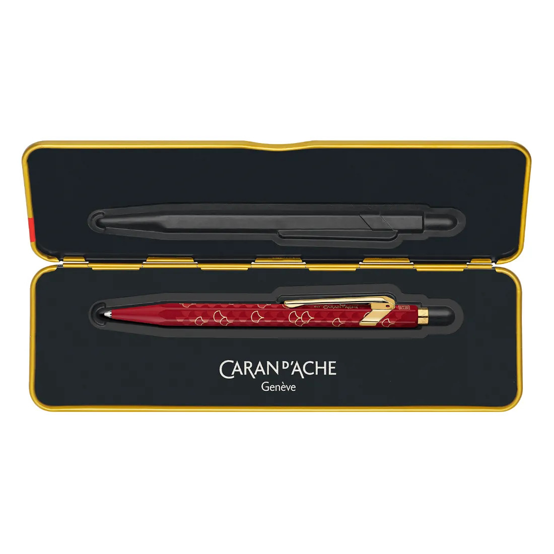 Cuerpo de aluminio hexagonal, ligero y duradero Acabado satinado rojo granate con tampografía ?escama de dragón? roja y dorada Clip y pulsador de metal flexible, ambos con acabado en oro amarillo