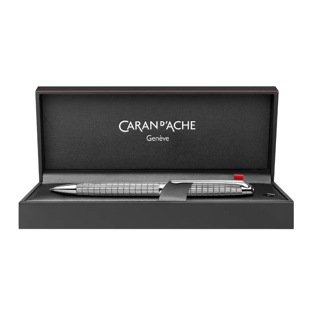 Cuerpo redondo recubierto de rodio y plata Fresa de diamante talla baguette grabado profundo Logotipo de Caran d Ache y Swiss Made grabado en el anillo Rotativo de precisión mecanismo para una comodidad óptima del usuario Botón de tapa con identificación Caran d Ache (hexágono lacado en negro) Clip y botón rodiados