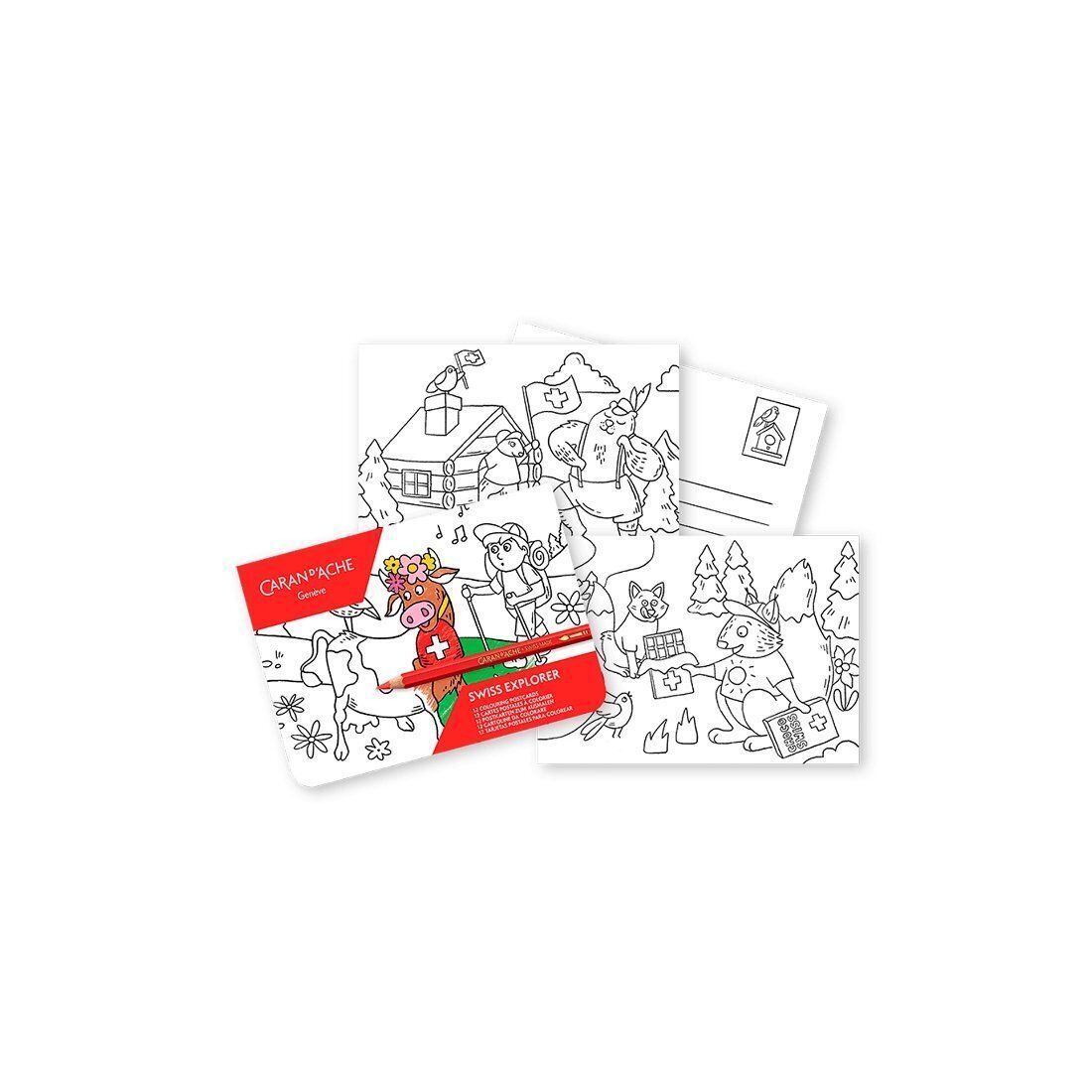 Detalles Estuche metálico rojo que contiene un surtido listo para usar de productos solubles en agua y colorantes: Una caja de cartón con 12 lápices de colores Swisscolor Aquarelle Una caja de cartón con 10 pasteles de cera solubles en agua Swisscolor Aquarelle Un pincel mediano con depósito de agua Un juego de 12 postales Swiss Explorer para colorear Una hoja original de 13 pegatinas sobre el tema de los viajes y Suiza