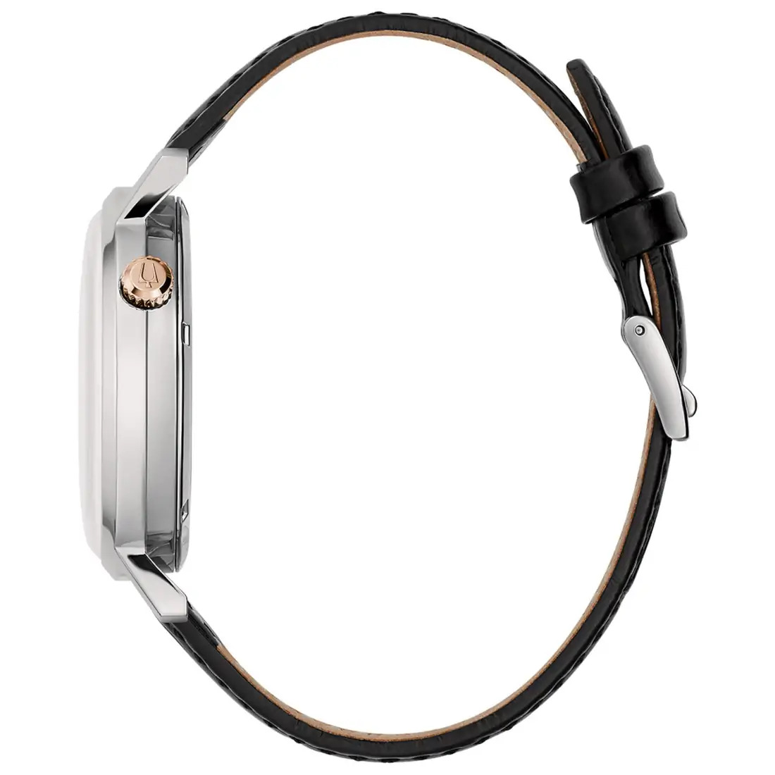 Reloj Bulova Aerojet para caballero Movimiento mecánico de cuerda automática de 3 manecillas, reserva de marcha de 40 horas Caja realizada en acero inoxidable. Carátula plateada con apertura, indicadores y manecillas en oro rosa. Corona colocada a las dos hrs., tapa transparente atornillable. Cristal mineral. Correa de piel negra con broche tipo hebilla de tres piezas.