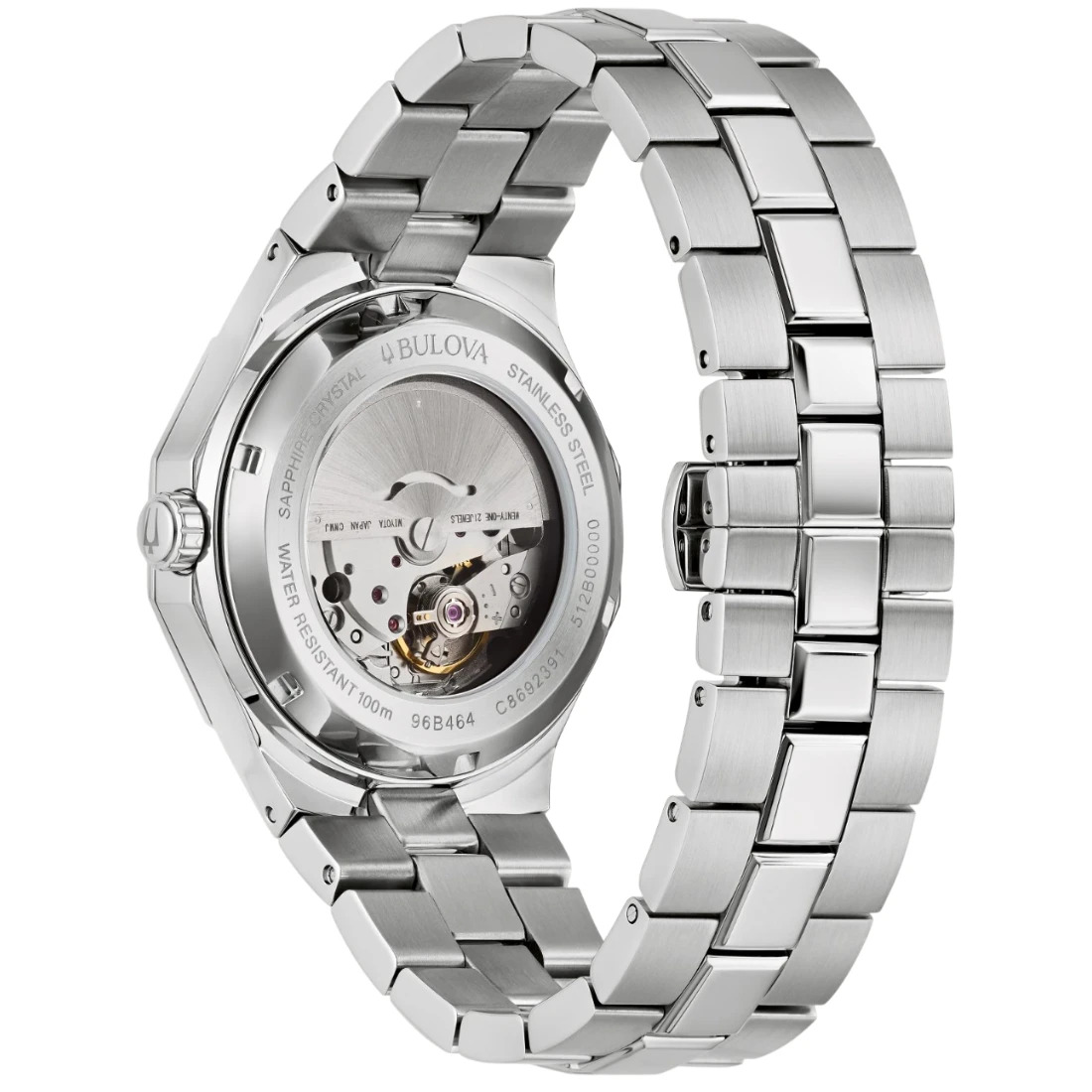 Reloj Bulova colección Classic Prestige para caballero. Caja de acero inoxidable plata facetada de 40 mm con bisel geométrico. Carátula verde con manecillas y marcadores aplicados en color plata con Super-Luminova y fechador. Brazalete biselado de 3 eslabones con acabado cepillado y pulido con y broche desplegable de pulsador.