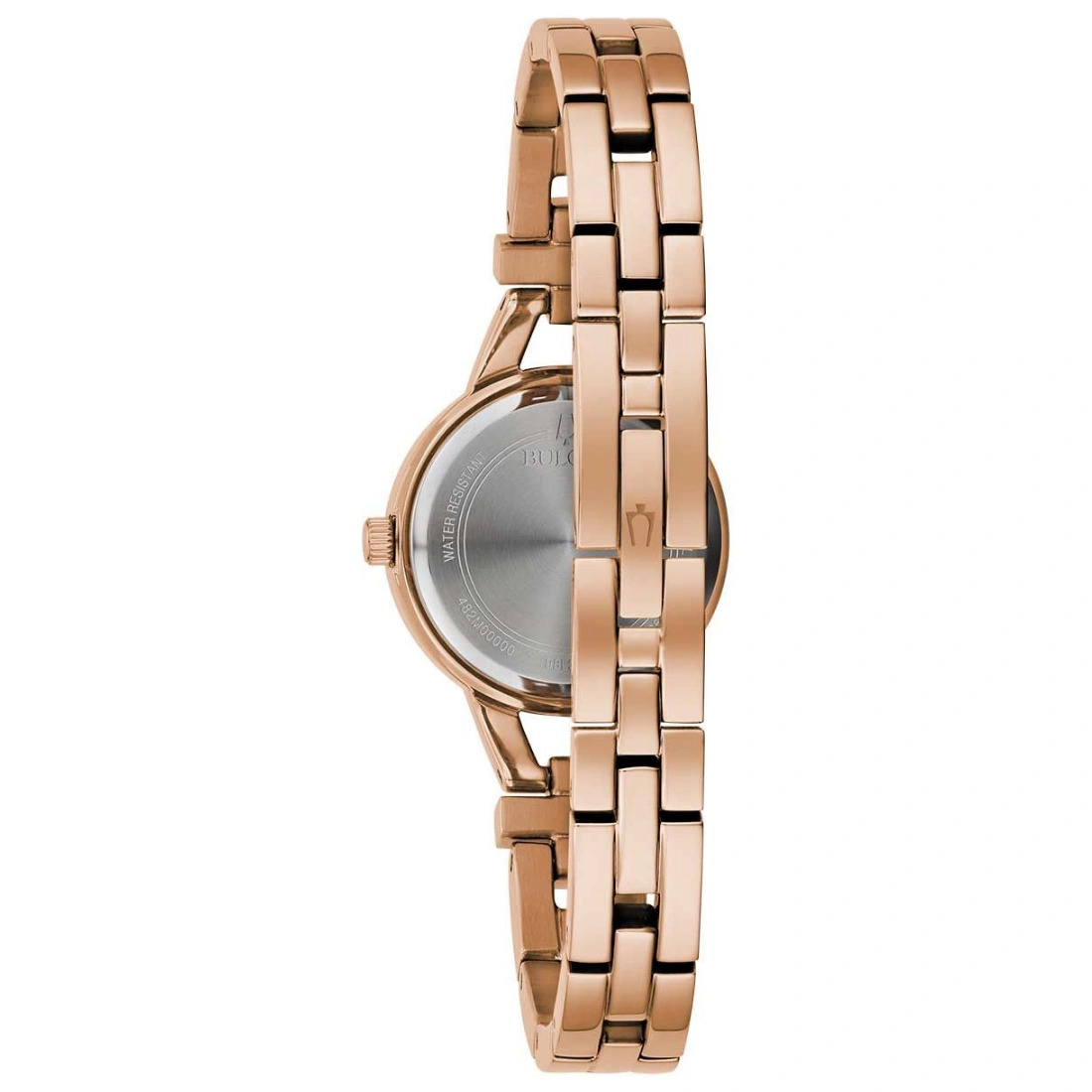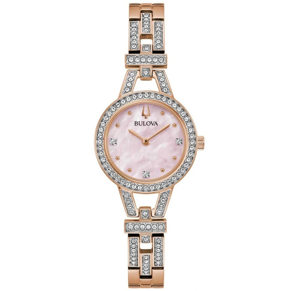 Reloj Bulova colección Crystal para Dama. Cristales montados de forma individual en carátula y brazalete. Movimiento de Cuarzo de 2 manecillas. Caja y brazalete realizados en acero inoxidable acabado PVD tono oro rosa.