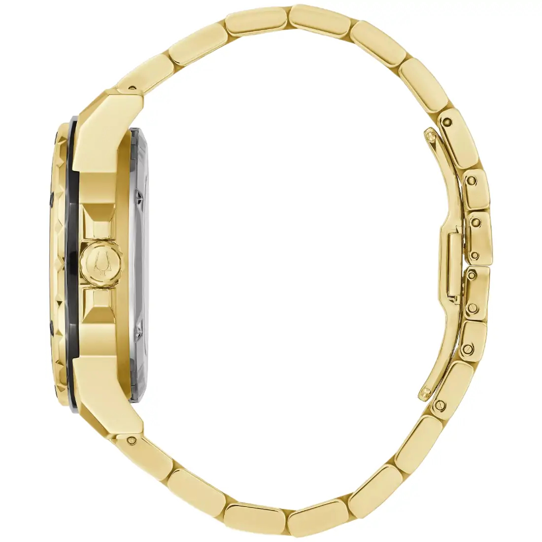 Reloj Bulova mecánico de cuerda automática Colección Marine Star para caballero. Movimiento mecánico de cuerda automática de 3 manecillas. Reserva de marcha de 42 horas Caja y brazalete realizados en acero inoxidable acabado PVD dorado. Carátula texturizada en negro, con apertura que permite ver el mecanismo en movimiento. Indicadores y manecillas luminiscentes en dorado. Tapa transparente. Cristal mineral.