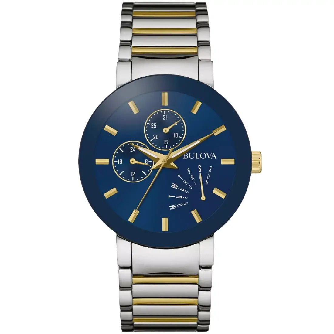 Reloj Bulova Modern para caballero. Movimiento de cuarzo de 6 manecillas y 3 subcarátulas. Caja y brazalete de acero inoxidable en dos tonos acero/dorado, broche desplegable de doble pulsador. Carátula azul, indicadores y manecillas en dorado. Cristal mineral abombado