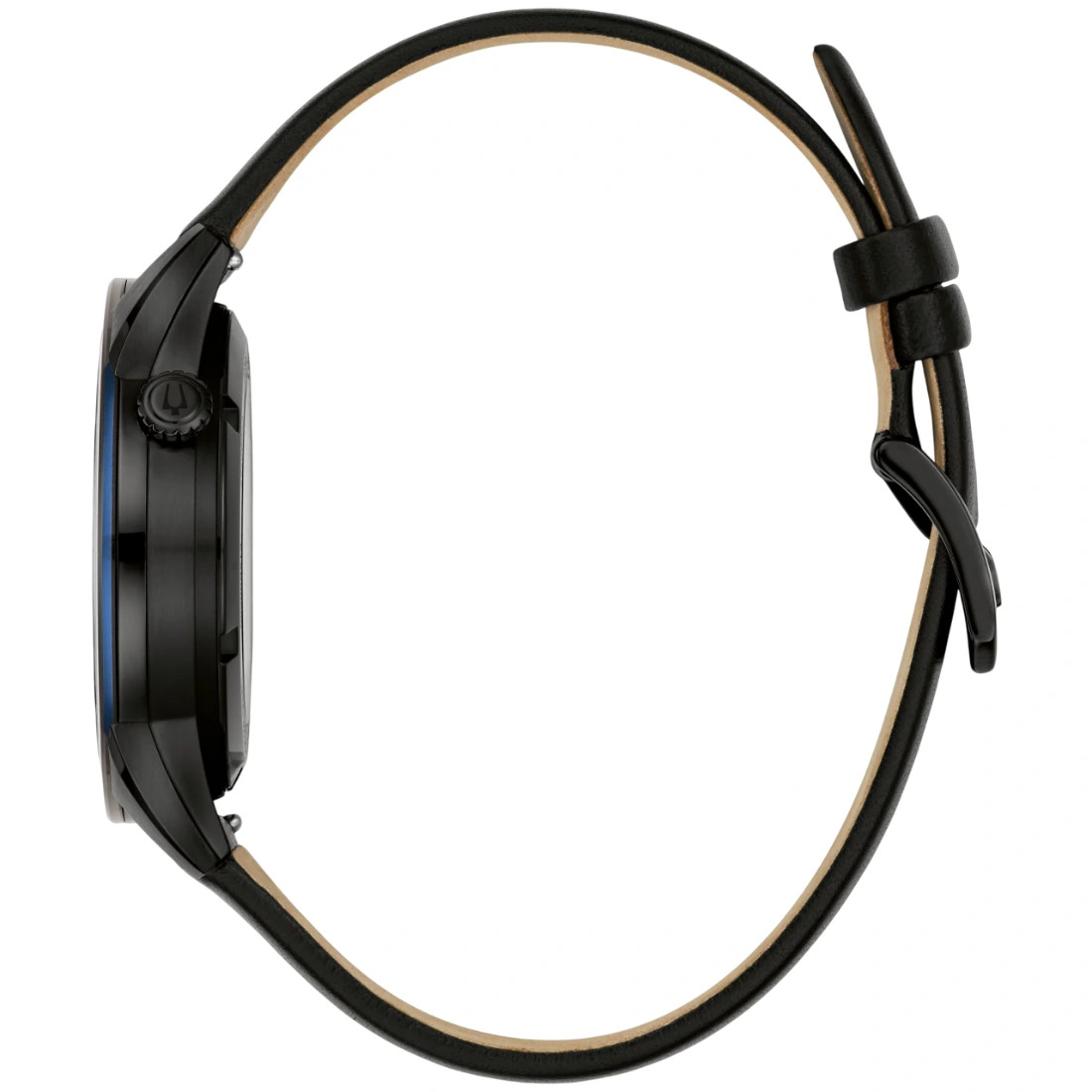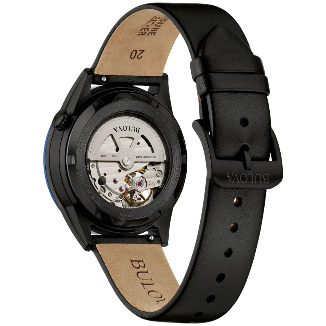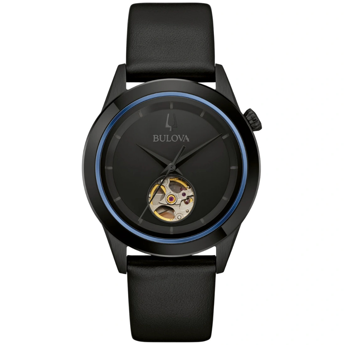 Reloj Bulova para Caballero colección Modern. Movimiento mecánico de cuerda automática de 3 manecillas y 21 joyas. Reserva de marcha de 42 horas. Caja realizada en acero inoxidable acabado PVD negro, bisel superior en azul. Carátula negra con apertura que permite observar el movimiento en funcionamiento del reloj, indicadores, manecillas y corona en negro. Cristal de zafiro con tratamiento antirreflejante. Correa de piel suave en negro, broche tipo hebilla de 3 piezas.