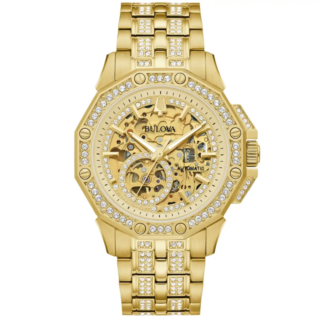 Reloj Bulova Colección Octava para caballero. 251 cristales montados a mano en carátula, bisel y brazalete. Movimiento mecánico de cuerda automática de 3 manecillas. Reserva de marcha de 42 horas. Caja y brazalete realizados en acero inoxidable acabado PVD dorado, broche desplegable de doble pulsador. Carátula esqueletada que permite observar el mecanismo en funcionamiento del reloj. Indicadores, manecillas y maquinaria en dorado. Cristal mineral. Tapa transparente