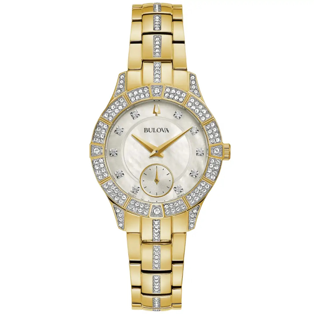 Reloj Bulova Phantom para dama con cristales.174 cristales montados de forma individual en caja, carátula y brazalete. Movimiento de cuarzo de 3 manecillas y subcarátula con segundero. Caja y brazalete realizados en acero inoxidable acabado PVD dorado, broche desplegable de doble pulsador. Bisel y brazalete adornado con cristales. Carátula en madre perla Blanca, adornada con cristales como indicadores, manecillas en dorado. Cristal mineral.