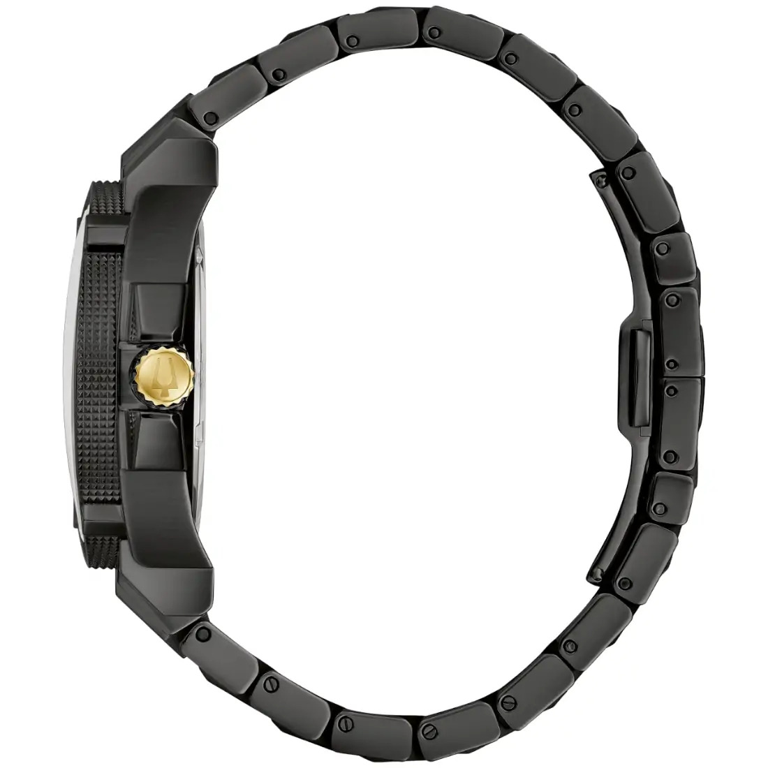Bulova presenta una nueva incorporación a la colección Icon para hombres aventurera y con estilo, con el fin de cumplir el compromiso de la línea de ofrecer una precisión excepcional y un diseño notable. La caja negra de 40 mm con chapado ionizado está fabricada con acero inoxidable 316L para ofrecer una excepcional durabilidad y un estilo moderno, con detalles en tono dorado y un cristal de zafiro curvo. El dial negro de varios niveles posee manecillas y marcadores luminiscentes en tono dorado y una pantalla de fecha.
