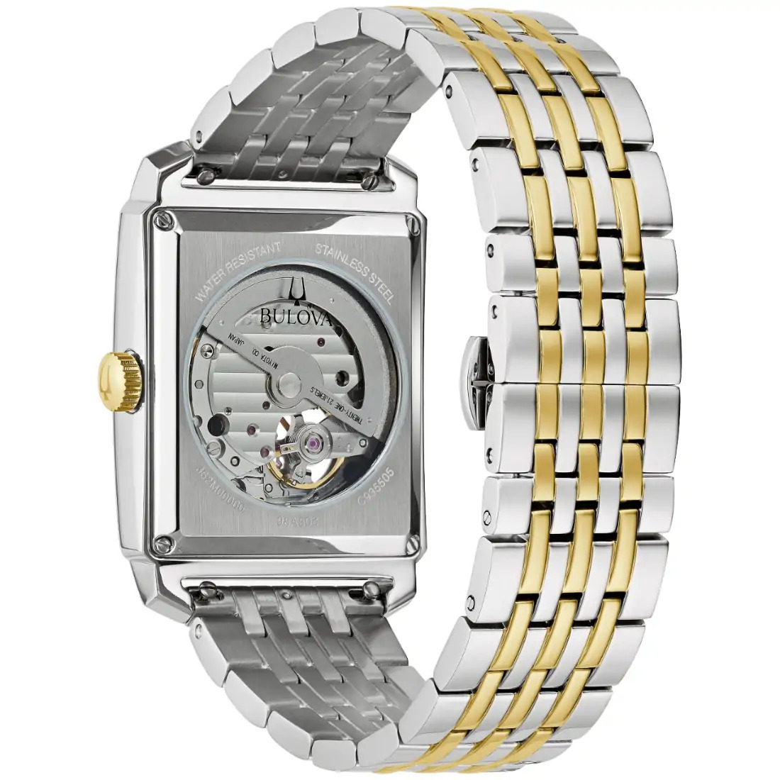 De la colección Sutton, este nuevo reloj Bulova para hombre tiene un sofisticado estilo con un corazón mecánico. La refinada caja rectangular de acero inoxidable de dos tonos posee una estructura plateada y un marco con tonos dorados alrededor de un cristal mineral curvo. El dial texturado blanco y plateado viene con números arábigos en tono dorado y manecillas que combinan. A las 7 en punto, una apertura enmarcada ofrece un vistazo a los latidos del corazón del reloj, el movimiento mecánico de 21 joyas que tiene una reserva de marcha de 42 horas.