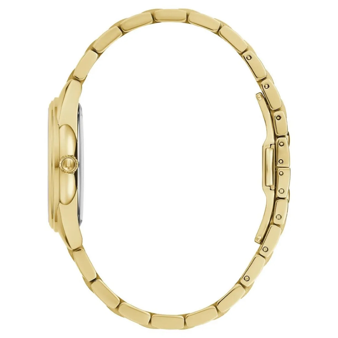 Reloj Bulova colección Sutton para dama. 8 diamantes montados a mano de forma individual en carátula como indicadores. Movimiento de cuarzo de 3 manecillas. Caja y brazalete con broche desplegable de doble pulsador, realizados en acero inoxidable acabado PVD dorado. Carátula blanca, indicadores y manecillas en dorado. Cristal zafiro. Resistencia al agua de hasta 30 metros.