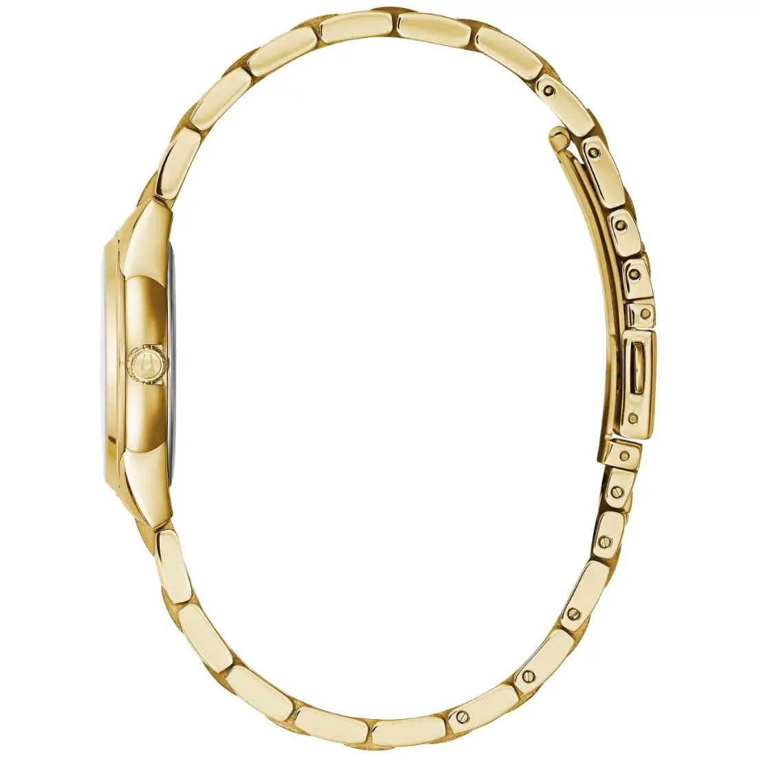 Reloj Bulova Colección Sutton para dama con 3 diamantes montados de forma individual a mano en carátula como indicadores. Movimiento de cuarzo de 3 manecillas. Caja y brazalete realizados en acero inoxidable acabado PVD dorado, broche desplegable de doble pulsador. Carátula plateada, indicadores y manecillas en dorado. Cristal mineral.