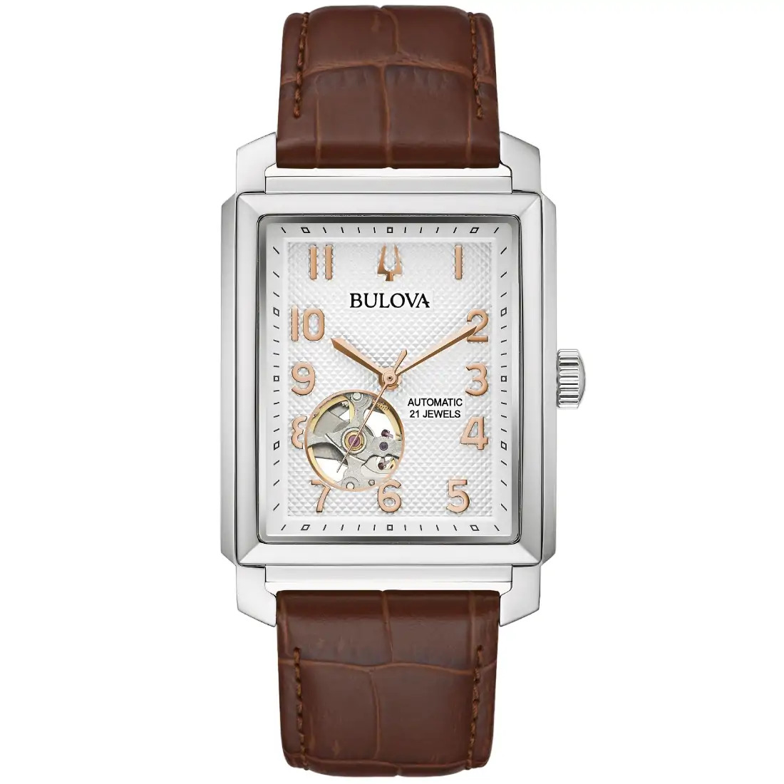 Reloj Bulova para caballero Colección Sutton, inspirado en el Bulova 1948 President. Reserva de marcha de 42 horas. Movimiento mecánico de cuerda automática de 3 manecillas. Caja rectangular realizada en acero inoxidable. Carátula texturizada blanca, con apertura que permite ver el funcionamiento del reloj en movimiento, manecillas e indicadores en oro rosa. Correa de piel café acabado tipo cocodrilo, broche tipo hebilla de 3 piezas. Tapa transparente. Cristal mineral.
