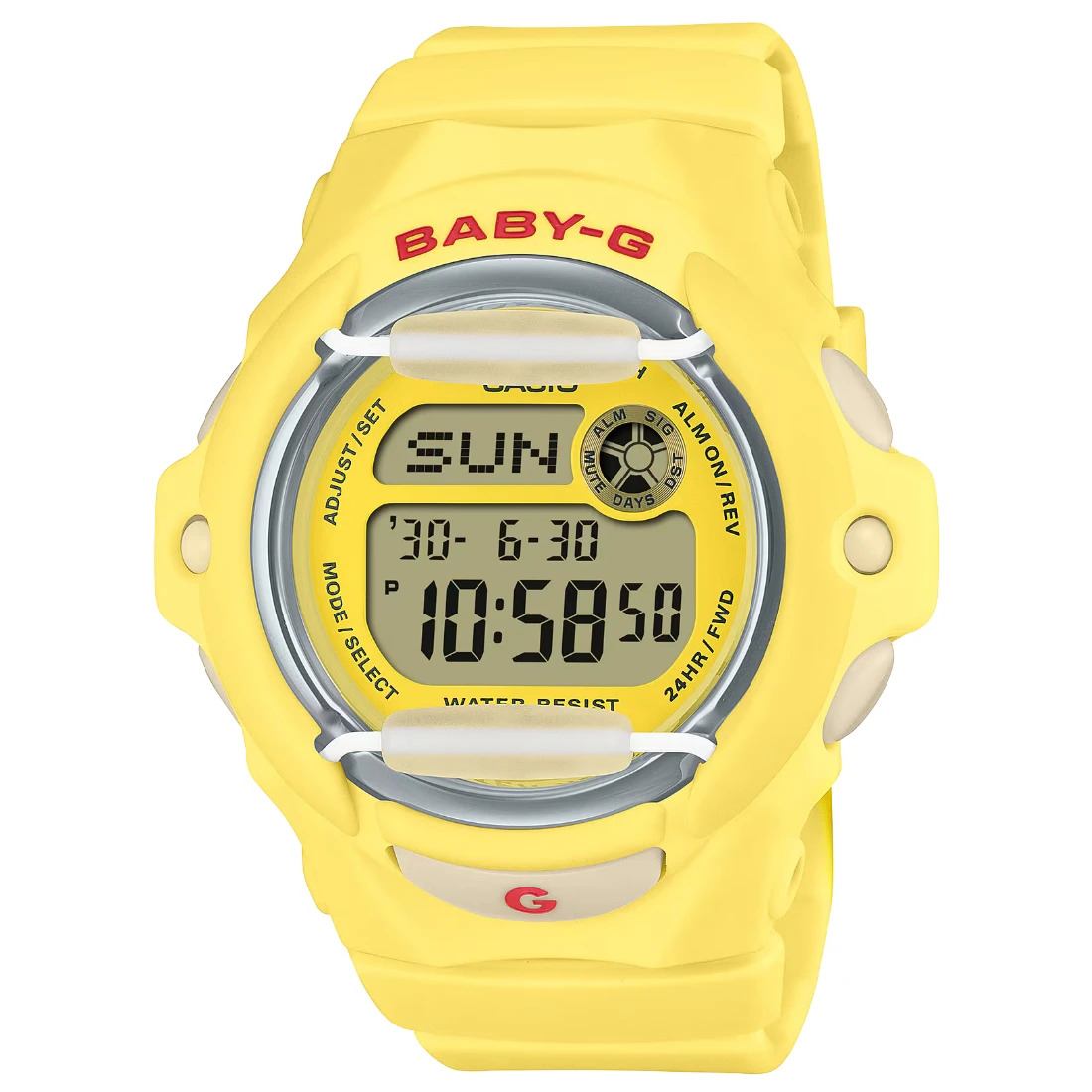 Tamaño de la caja (L× W× H): 45.9 × 42.6 × 16.4 mm Material de la caja/bisel: Resina Peso: 43 g Correa de resina Resistente a impactos Resistencia al agua de 200 m Fuente de alimentación: pila
