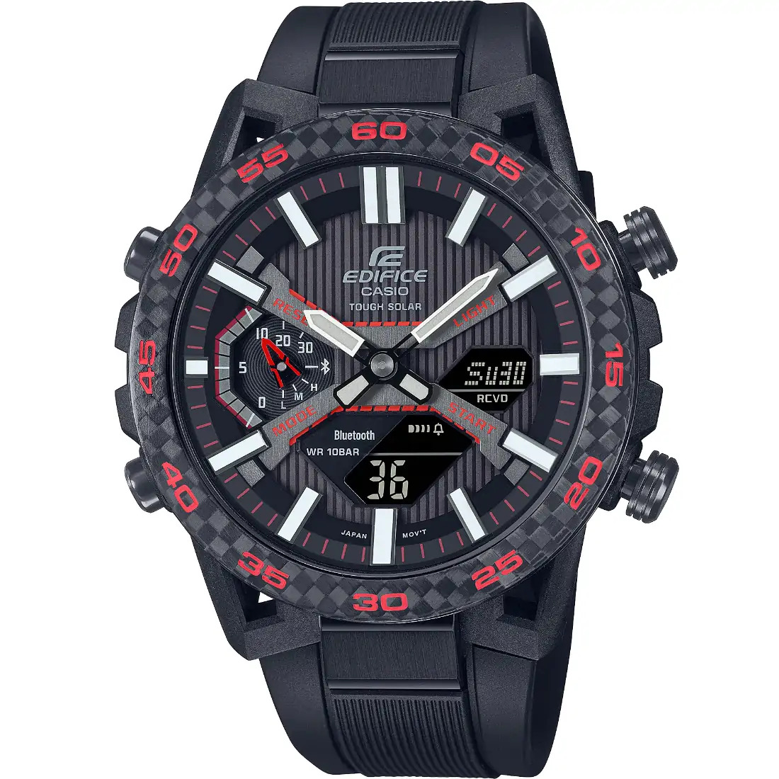 Tamaño de la caja (L× W× H): 51 × 47.8 × 10.8 mm Material de la caja/bisel: Carbono/acero inoxidable Peso: 62 g Correa de resina Resistencia al agua de 100 m Fuente de alimentación: Tough Solar (con energía solar)
