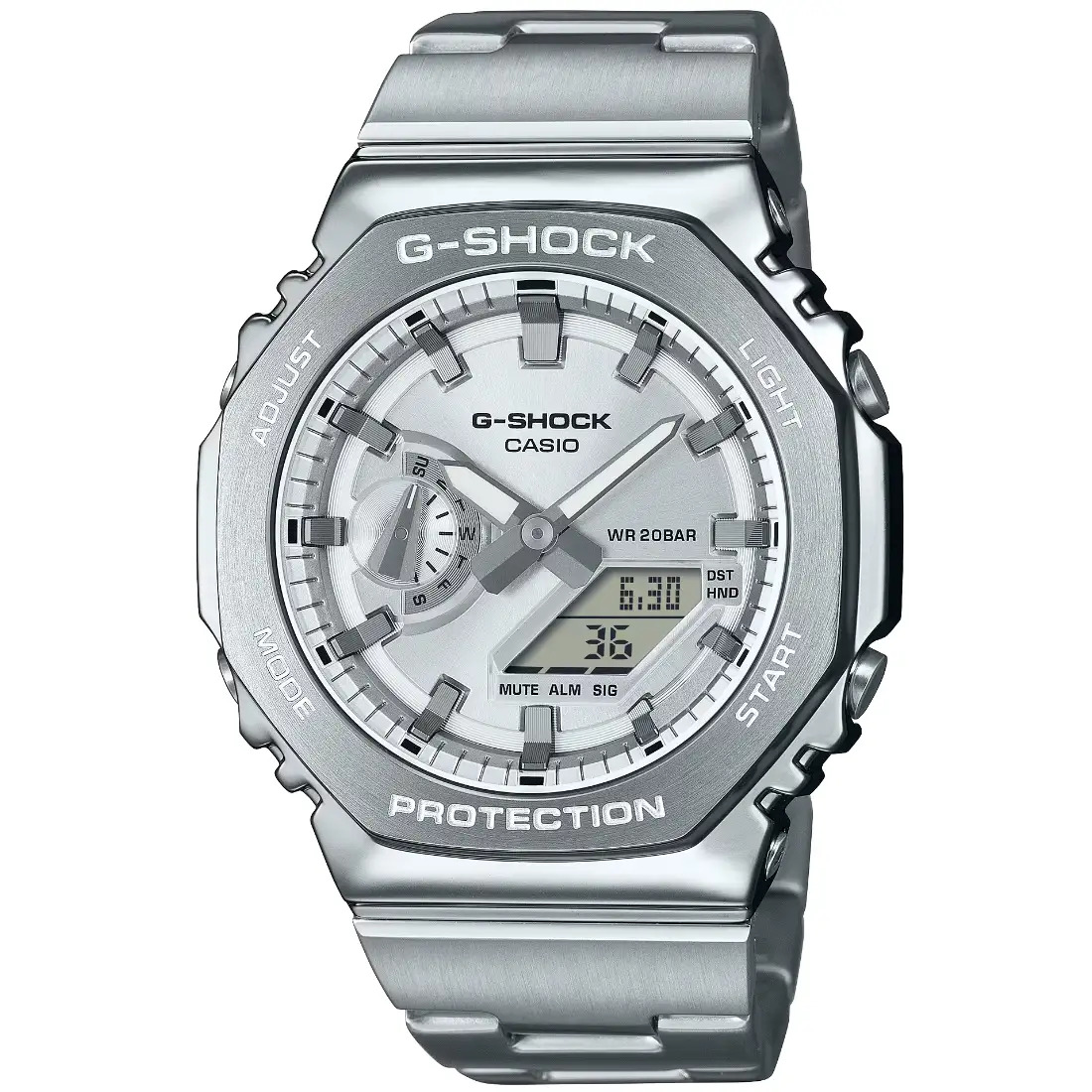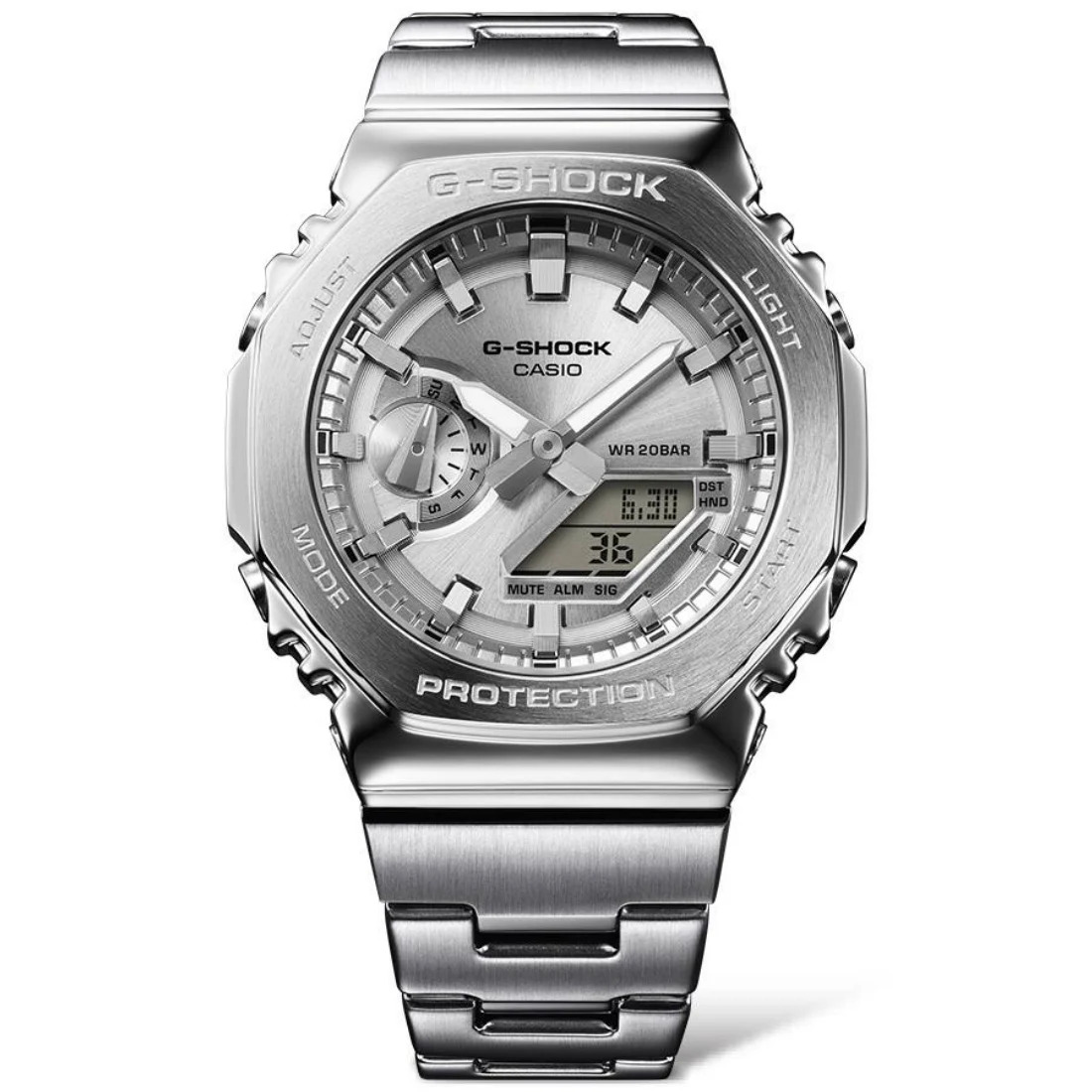 El marco octogonal de acero inoxidable, meticulosamente forjado y pulido, ofrece un diseño simple pero resistente. Con una carcasa de resina fina reforzada con fibra de vidrio, es la más delgada de todos los modelos combinados de G-SHOCK, con solo 11,8 mm de grosor.