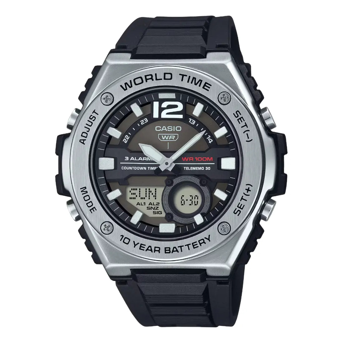 La audacia del revestimiento de metal se combina con un toque de sol sofisticado en la conveniencia analógica-digital integrada. Las marcas de índice metálicas proporcionan profundidad y dimensión a la esfera del reloj_ y el estilo de rayos de sol en el dial suaviza el aspecto en la medida justa. Estos relojes ofrecen funciones útiles que incluyen resistencia al agua de 100 metros_ una batería de 10 años y hora mundial.