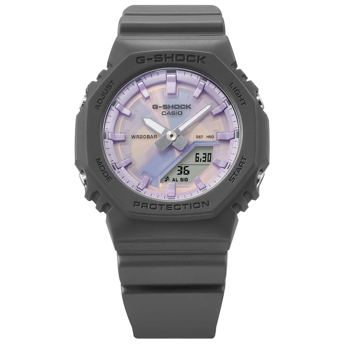 Ilumine su estilo de verano con un reloj GMA-P2100 con un dial de color polarizado. Este reloj compacto de aspecto lujoso ofrece un brillo colorido que cambia desde todos los ángulos, y los índices brillantes resplandecen con un impacto aún mayor. El bisel y la correa con textura mate proyectan un equilibrio llamativo y refinado que resalta la genialidad única del diseño.Los principales componentes de resina utilizados en el bisel y la correa están fabricados con resina de origen biológico, un material que se espera ayude a reducir el impacto medioambiental.
