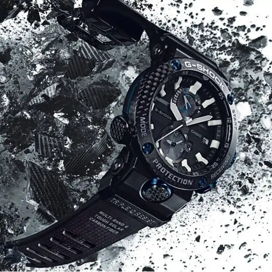MASTER OF G GRAVITYMASTER Un modelo que utiliza el material de carbono de la serie G-SHOCK GRAVITYMASTER para pilotos que trabajan en condiciones difíciles. La carcasa monocasco de carbono integra la carcasa en la cubierta posterior para crear una estructura de protección de carbono que protege el módulo de los impactos externos. Esto fortalece la resistencia a los impactos y elimina la necesidad de utilizar protectores de botones.