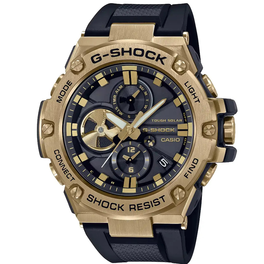 Deléitese con la ecléctica combinación G-STEEL de componentes de metal y resina en un popular esquema de colores: negro y dorado. La construcción resistente se combina con un diseño elegante con marco metálico con baño de iones en color dorado sobre una base negra. Esta sofisticada expresión de moda con una sensación de lujo y una apariencia moderna lo lleva a donde quiera ir.