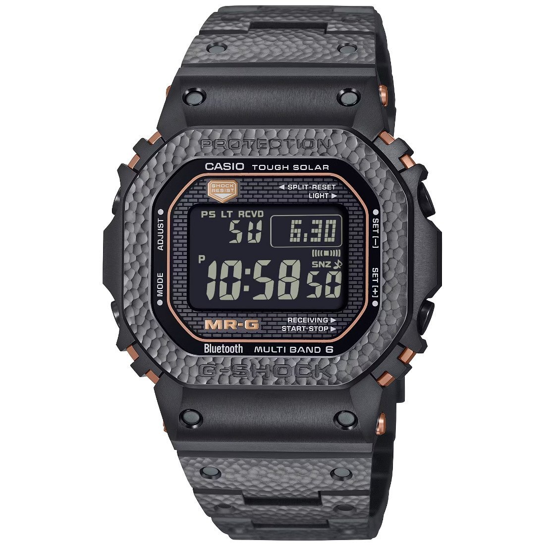 Tamaño de la caja (largo × ancho × alto): 49.4 × 43.2 × 12.9 mm Material de la caja/bisel: Titanio Peso: 112 g Correa de titanio Broche triple de un toque y cierre hermético Resistente a impactos Resistencia al agua de 200 m Bluetooth: Se conecta a un teléfono inteligente y ajusta automáticamente la hora. Reloj radio-controlado; Multiband 6 Fuente de alimentación: Tough Solar (con energía solar)