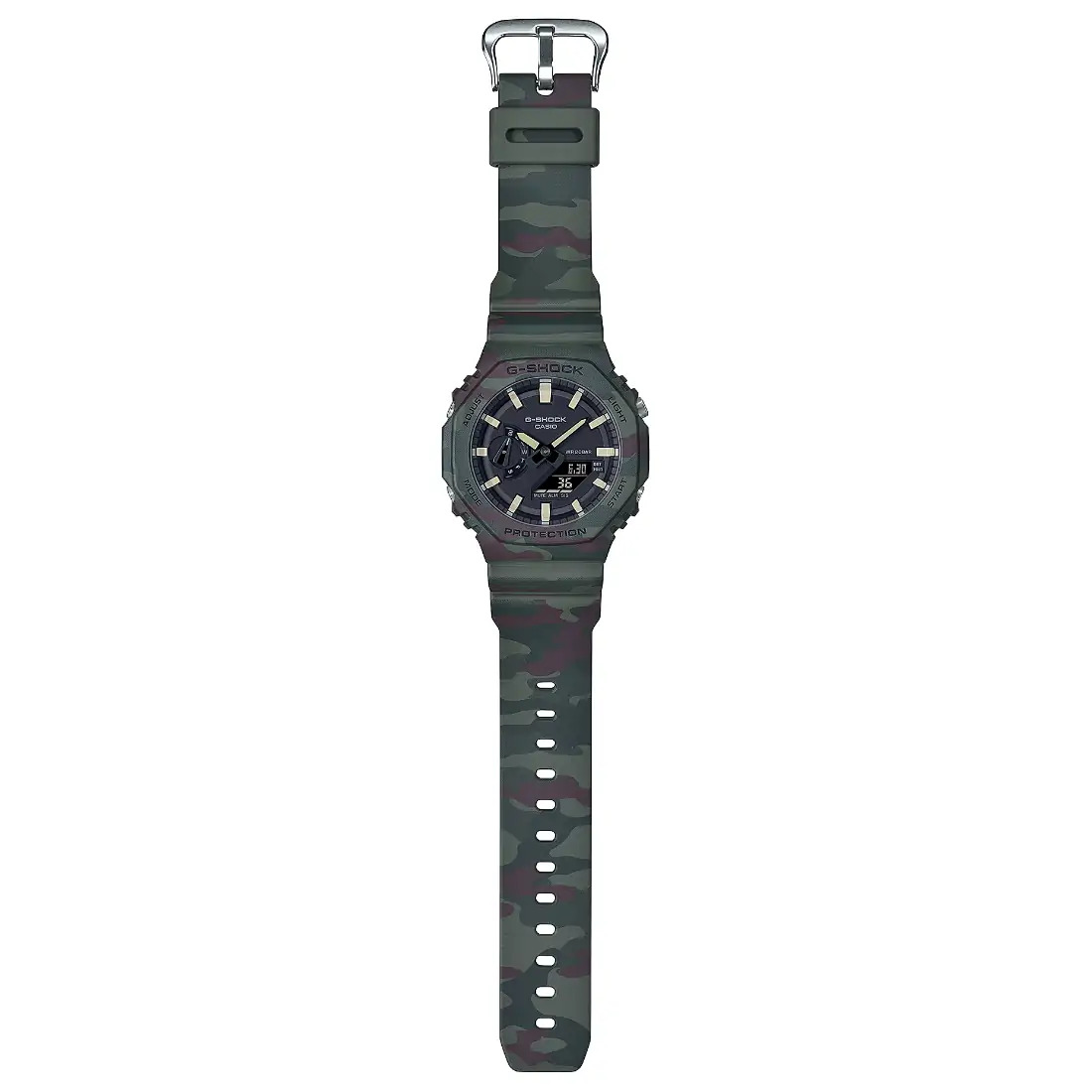 De la mano de la resistencia de G-SHOCK, un diseño inspirado en los aventureros cuyo amor por la naturaleza no tiene límites. Cambie entre las correas y los marcos intercambiables para obtener un GAE-2100 octogonal y delgado con un espíritu aún más salvaje. El camuflaje verde inspirado en la naturaleza y el naranja vibrante de la moda de las actividades al aire libre lo llevan de la moda urbana a la exploración de la naturaleza con un estilo casual y atractivo.