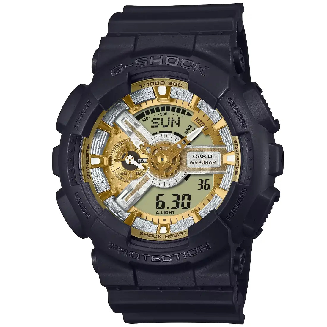 Disfrute de un toque fresco y audaz en un color totalmente nuevo con el siempre popular G-SHOCK de carcasa grande. El GA-110 con su distintiva carcasa grande utiliza el clásico negro para la correa y el marco, y un color audaz en el dial. Este novedoso diseño con toques rústicos ofrece un accesorio elegante y moderno para el estilo urbano.