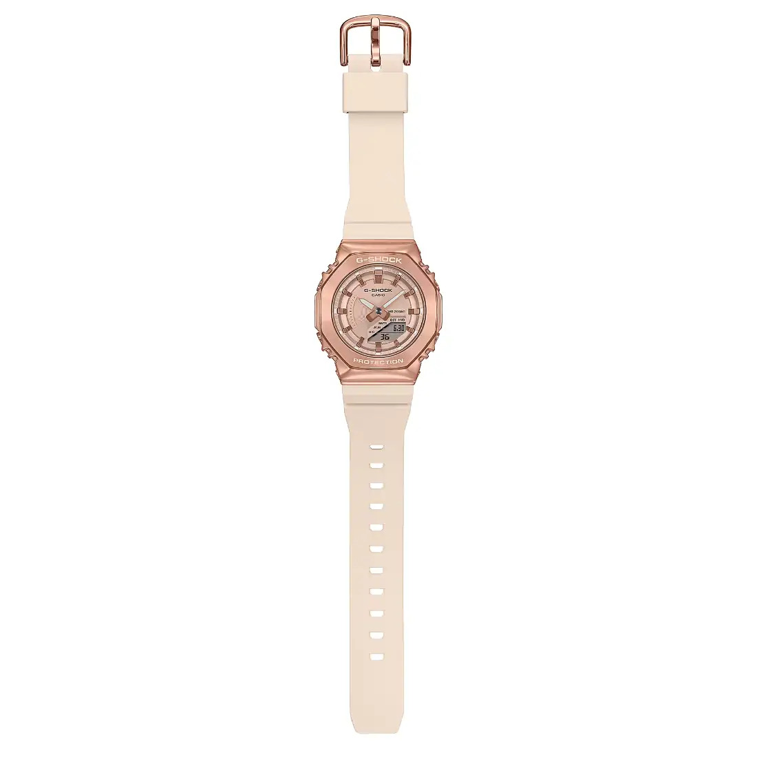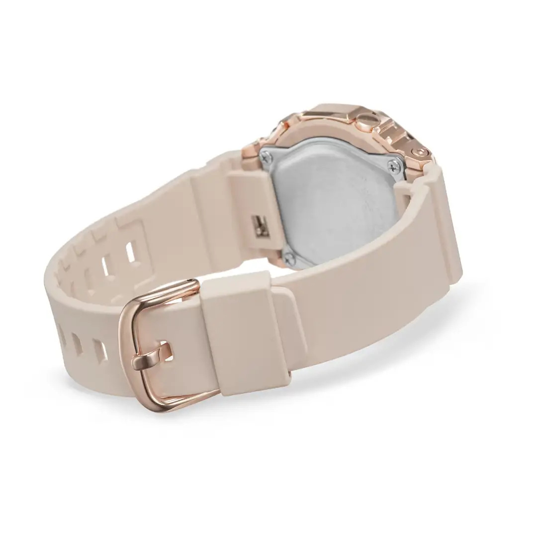 Brillo y resplandor en tono oro rosa sobre beige rosa en un G-SHOCK más pequeño y compacto. Acabado en baño de iones en tono oro rosa, el marco metálico es todo un símbolo de elegancia. La hebilla, también bañada en iones de oro rosa, contrasta hermosamente con la correa beige rosa para hacer que el metal brille de verdad.