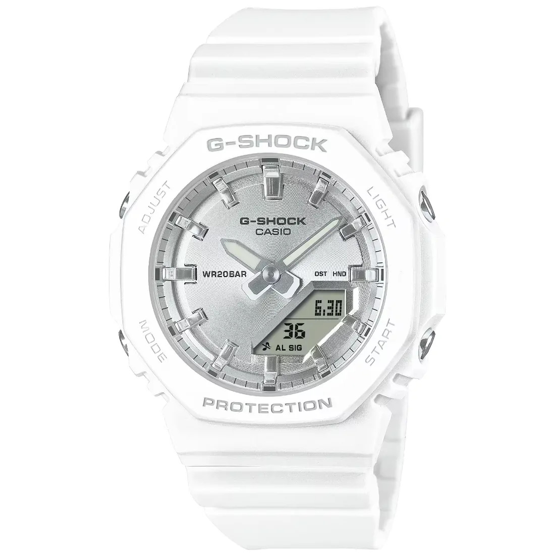Tamaño de la caja (L× W× H): 46 × 40.2 × 11.2 mm Material de la caja/bisel: Resina/resina de base biológica Peso: 4o g Correa de resina de base biológica Resistente a impactos Resistencia al agua de 200 m Fuente de alimentación: pila