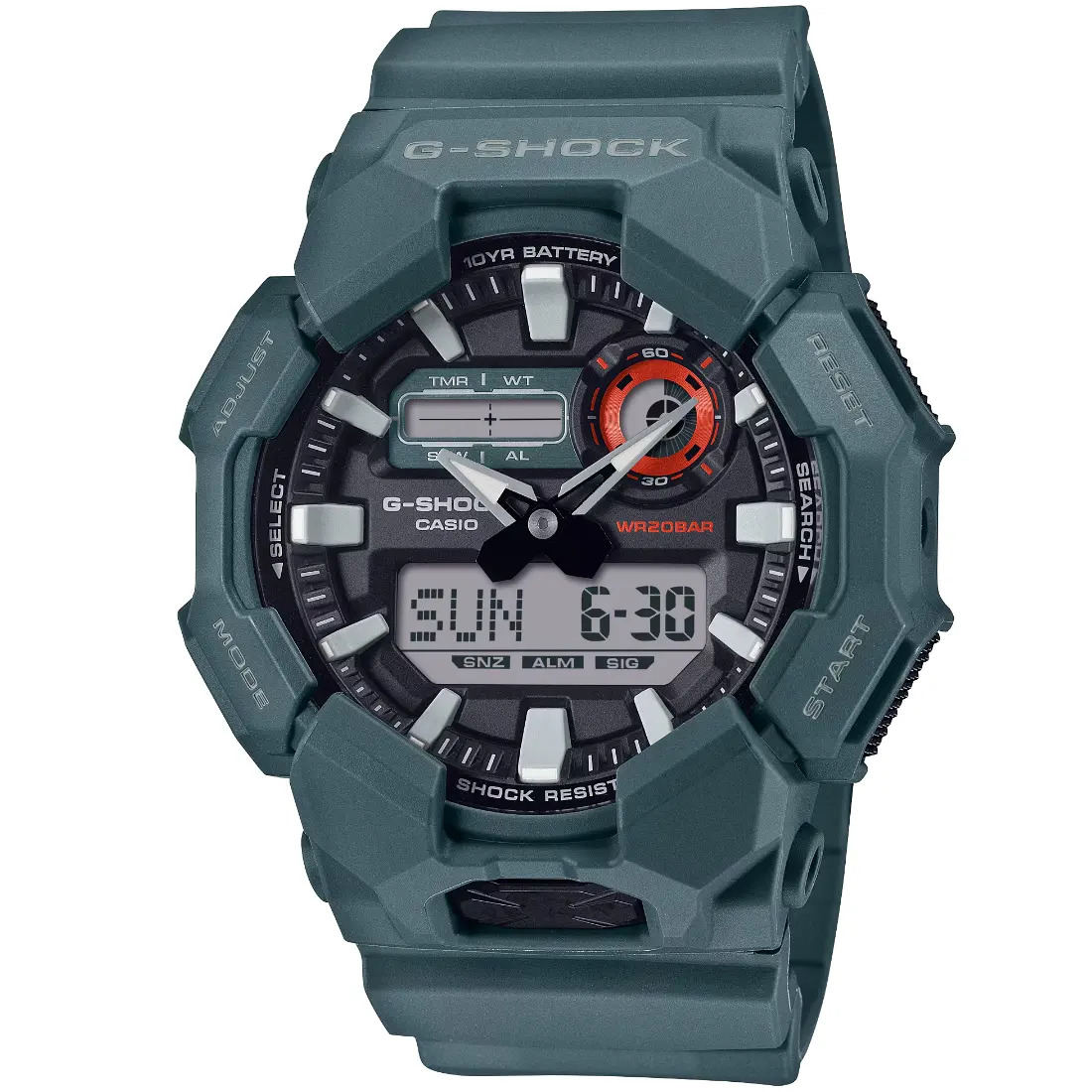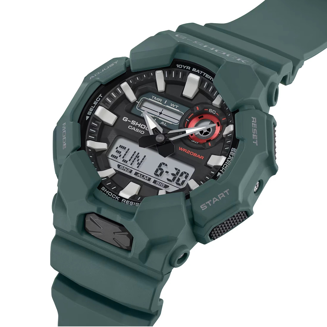 Tamaño de la caja (L× W× H): 55.1 × 51.9 × 17.5 mm Material de la caja/bisel: Carbono de origen biológico/resina de origen biológico Peso: 67 g Correa de resina de base biológica Resistente a impactos Estructura Carbon Core Guard Resistencia al agua de 200 m Fuente de alimentación: pila