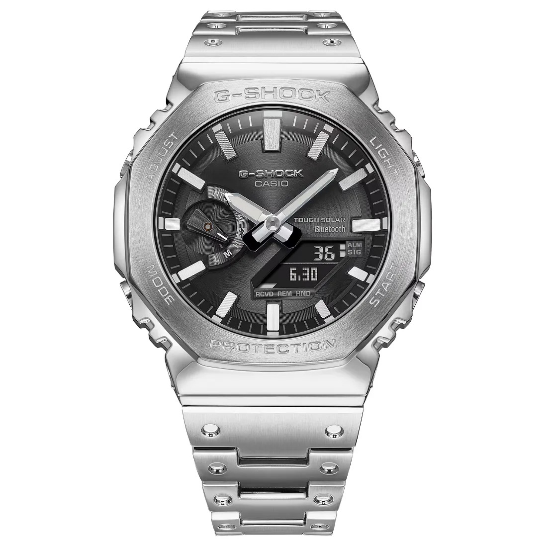 La elegante construcción totalmente metálica con una carcasa con fondo atornillado, marco y correa confeccionada en acero inoxidable, crea un diseño simplificado y minimalista, a la vez que protege el módulo de los impactos cuando se cae. El montaje de alta densidad mantiene delgado el módulo de combinación analógica-digital, a la vez que proporciona las funciones avanzadas que le encantan en un perfil compacto y un ajuste cómodo.