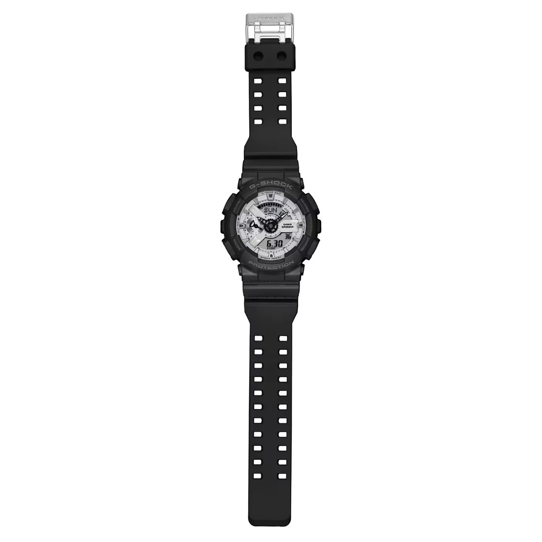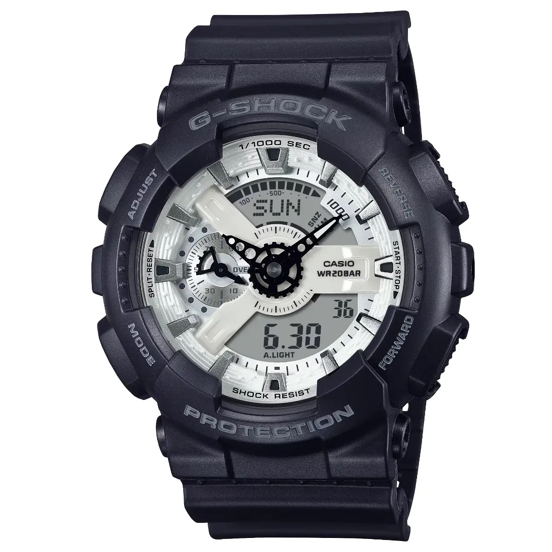 El G-SHOCK en blanco y negro es la combinación perfecta de audacia y elegancia. Su base negra azabache se complementa con un brillante dial blanco de deposición de vapor, creando un contraste monocromático único.