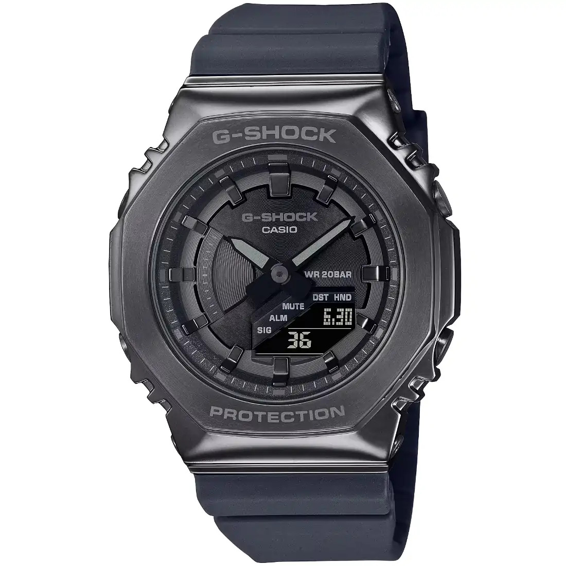 Consiga delgadez, sobriedad y audacia con un G-SHOCK de tamaño mediano, forma octogonal, protección metálica y con el icónico diseño original. Forjado en acero inoxidable con un acabado pulido y redondeado, el marco resistente transmite un estilo superior en todo momento. Solo las letras de la parte superior e inferior están grabadas para lograr un diseño simple de una pieza. El dial, aplanado para conseguir delgadez, se trata con un baño de iones de color e indicadores espejados con el fin de agregar una profundidad brillante.