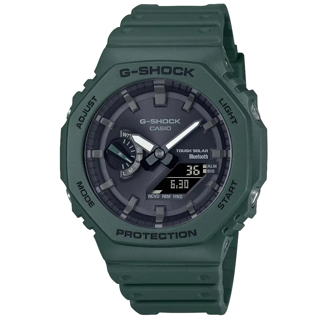 Tamaño de la caja (L× W× H): 48.5 × 45.4 × 11.9 mm Material de la caja/bisel: Carbono/resina Peso: 52 g Correa de resina Resistente a impactos Estructura Carbon Core Guard Resistencia al agua de 200 m Fuente de alimentación: pila con Tough Solar (con energía solar)