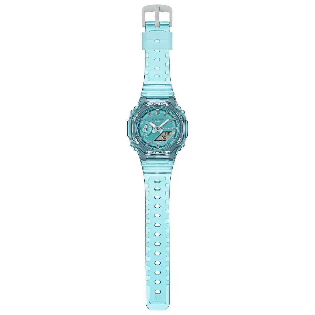 Incorpore el placer de un metal claro a la popular combinación analógica-digital GA-2100 en un perfil más delgado y compacto. Diseños metálicos translúcidos en una variedad de colores para relojes versátiles que combinan con cualquier atuendo durante todo el año. Las marcas de la hora tratadas con un acabado de deposición de vapor semimate dan vida al aspecto metálico claro. El dial y el anillo del dial de los modelos azul y rosa están tratados con pintura micropolarizada para crear un brillo misterioso y sutil.