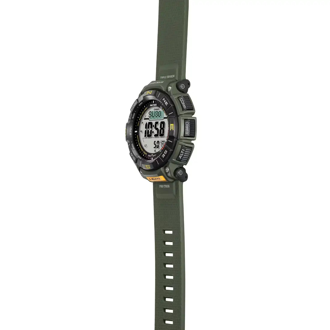 Salga al aire libre con un PRO TREK con funcionamiento con energía solar que cuenta con materiales ecológicos que cuidan el medioambiente. La línea PRO TREK de auténticos equipos para actividades al aire libre para los amantes de la naturaleza presenta el PRG-340, un reloj que incorpora plásticos de biomasa* respetuosos con el medioambiente, a la vez que ofrece el mismo ajuste cómodo para su muñeca.