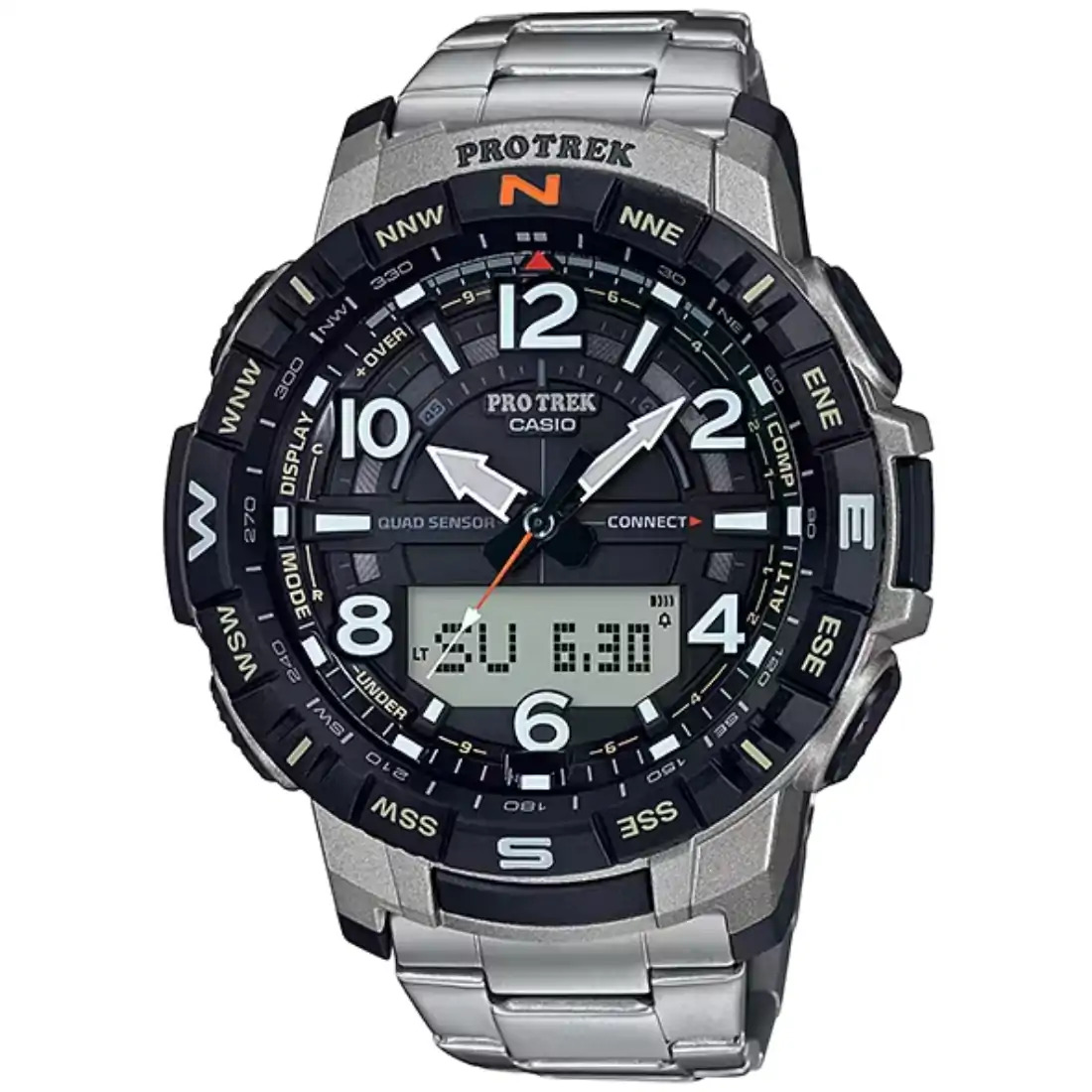 Un modelo PRT-B50 equipado con una función de vinculación con smartphone, además de un sensor cuádruple capaz de medir la cantidad de pasos, la dirección, la presión barométrica/altitud y la temperatura. Se utiliza titanio ligero y resistente a la corrosión para el material de la correa, lo que hace que el reloj sea adecuado para el uso diario y al aire libre. El esquema de color monocromático se intensifica coloreando con naranja el segundero y la letra “N” que indica el norte en el marco giratorio grande.