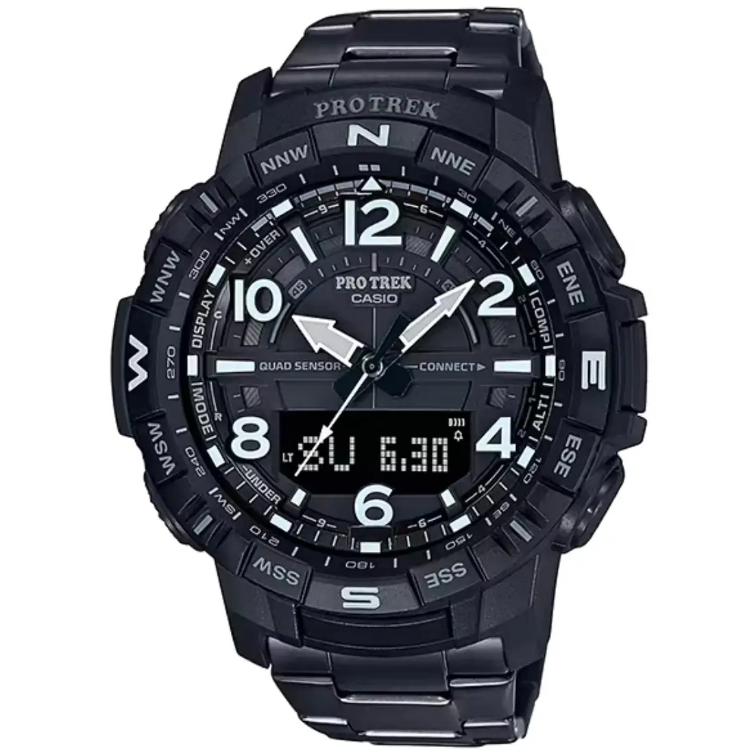 Tamaño de la caja (L× W× H): 57.5 × 50.8 × 15.8 mm Material de la caja/bisel: Resina Peso: 96 g Correa de titanio y hebilla de acero inoxidable Broche de una pulsación y triple pliegue Resistente a bajas temperaturas (-10°C / 14°F) Resistencia al agua de 100 m Fuente de alimentación: pila Conteo de pasos mediante sensor de aceleración de 3 ejes Altímetro Barómetro Brújula digital Termómetro
