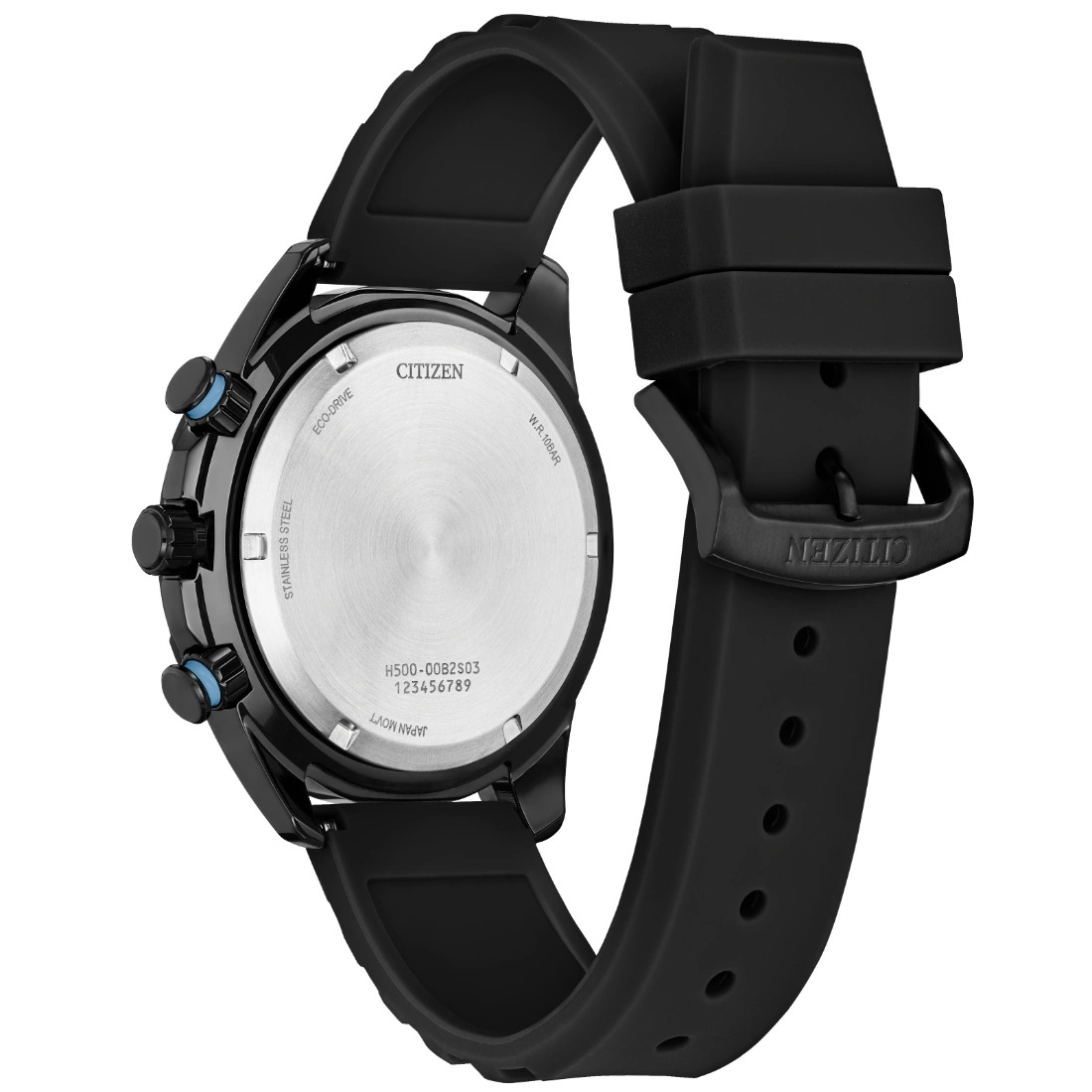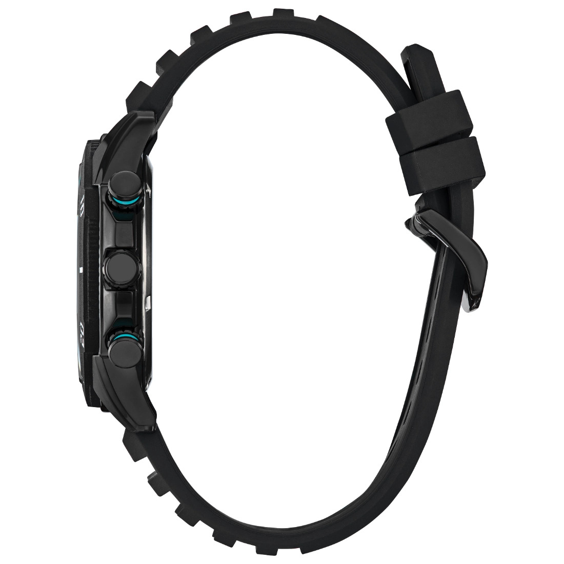 Atrevido y deportivo, este nuevo cronógrafo Brycen de Citizen está listo para cualquier aventura. El reloj mide 44.8 mm con caja ern acero inoxidable color negro acentuada con detalles azules en sus pulsadores de estilo deportivo. Un bisel giratorio de 60 minutos añade funcionalidad, mientras que una resistente correa de silicón negro sujeta el reloj a la muñeca.