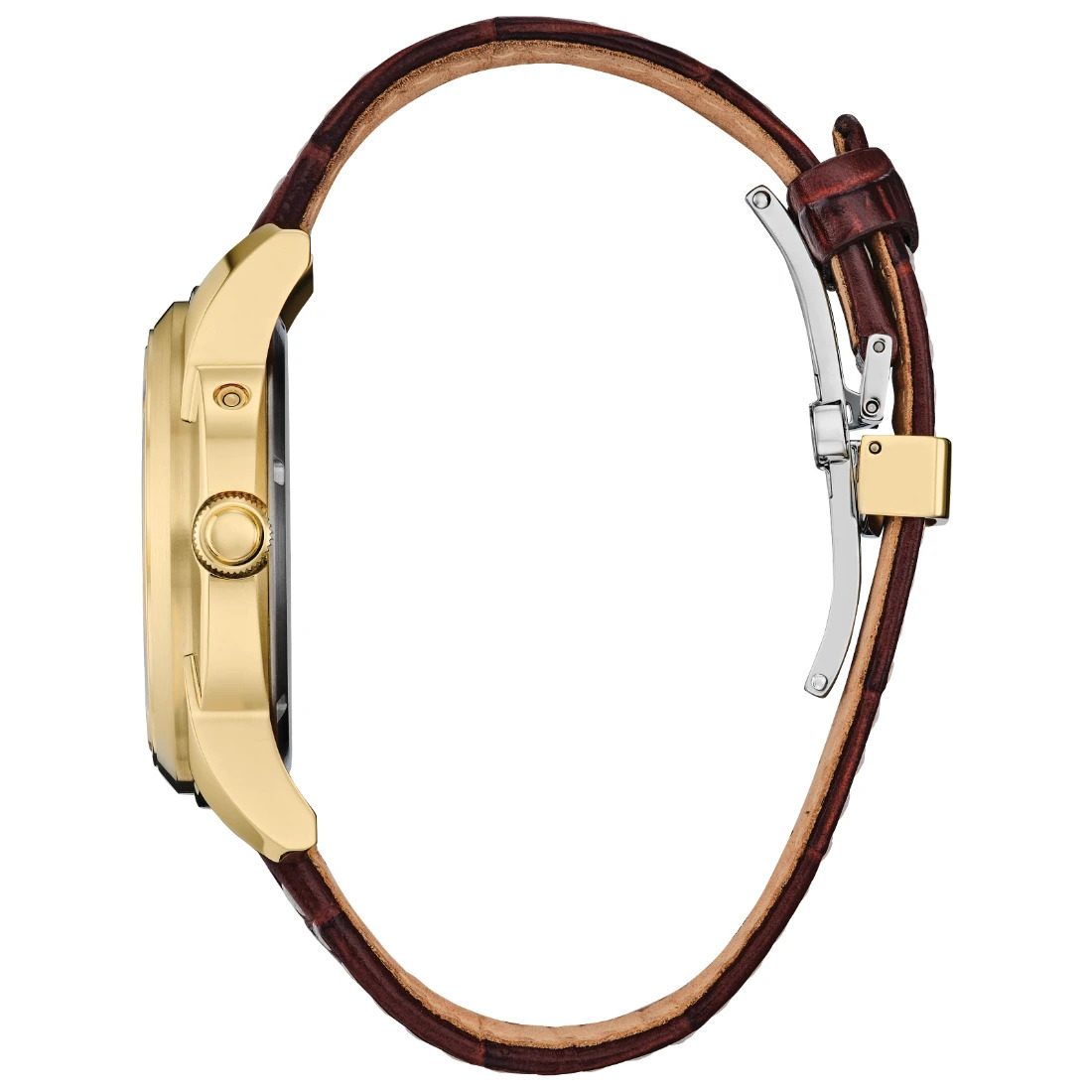 Aporta sofisticación a tu día a día con el nuevo reloj Calendrier. De estilo vanguardista, este reloj orientado al futuro mide 41.8 mm y está fabricado en acero inoxidable dorado. La corona empotrada y la correa de piel marrón le añaden distinción. En la carátula multidimensional, el reloj presenta indicadores analógicos para el mes, el día y la fecha, así como, un indicador de fases lunares en la posición de las 6.