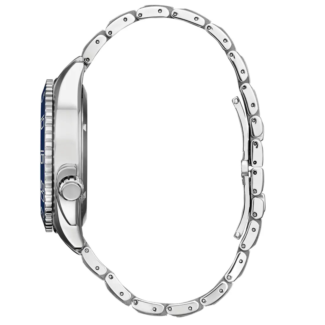 La más reciente incorporación a la colección Sport Luxury añade un toque de moda a los relojes de lujo para caballero. Diseñado para ser versátil y grandioso, con una caja y brazalete de acero inoxidable plateados y una llamativa carátula color azul metálico contenida en un cristal de zafiro y un bisel giratorio del mismo color. Cuenta con 3 manecillas e indicadores luminosos, fechador en la posición de las 6 y broche desplegable con botones para mejor acceso.