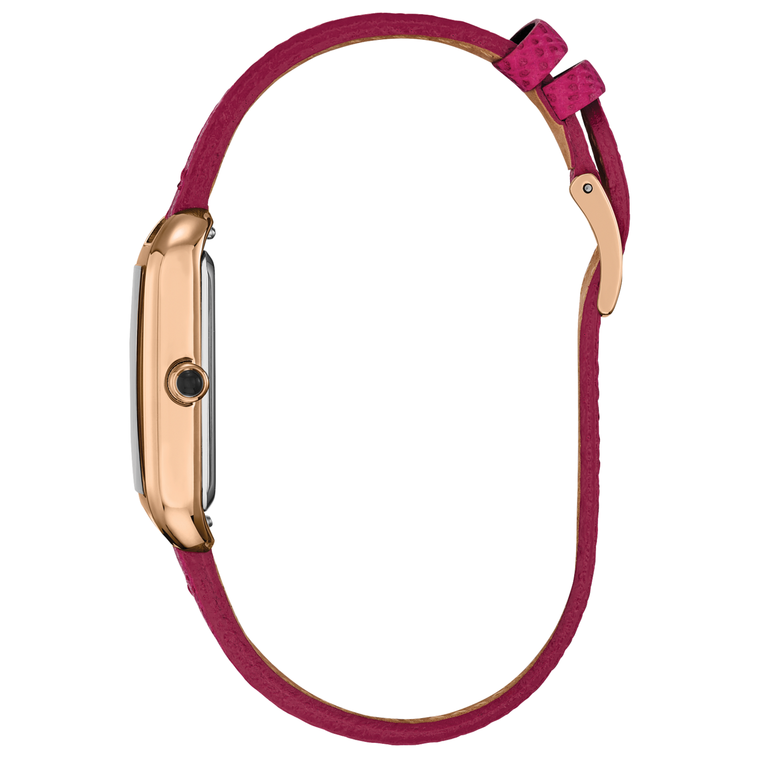 Líneas suaves y una sutil sofisticación definen la Colección Dress Classic, con esta última adición a la serie que muestra una vez más su estilo atemporal. Una caja de 23,5 mm con asas curvadas centra el elegante diseño, con el acero inoxidable en tono oro rosa que contrasta audazmente con el rosa de la correa de piel texturizada y la corona negra de zafiro sintético. La carátula minimalista en acabado madre perla blanco muestra la hora con elegancia. Este refinado reloj utiliza tecnología patentada Eco-Drive, que se alimenta de forma sostenible con cualquier tipo de luz.