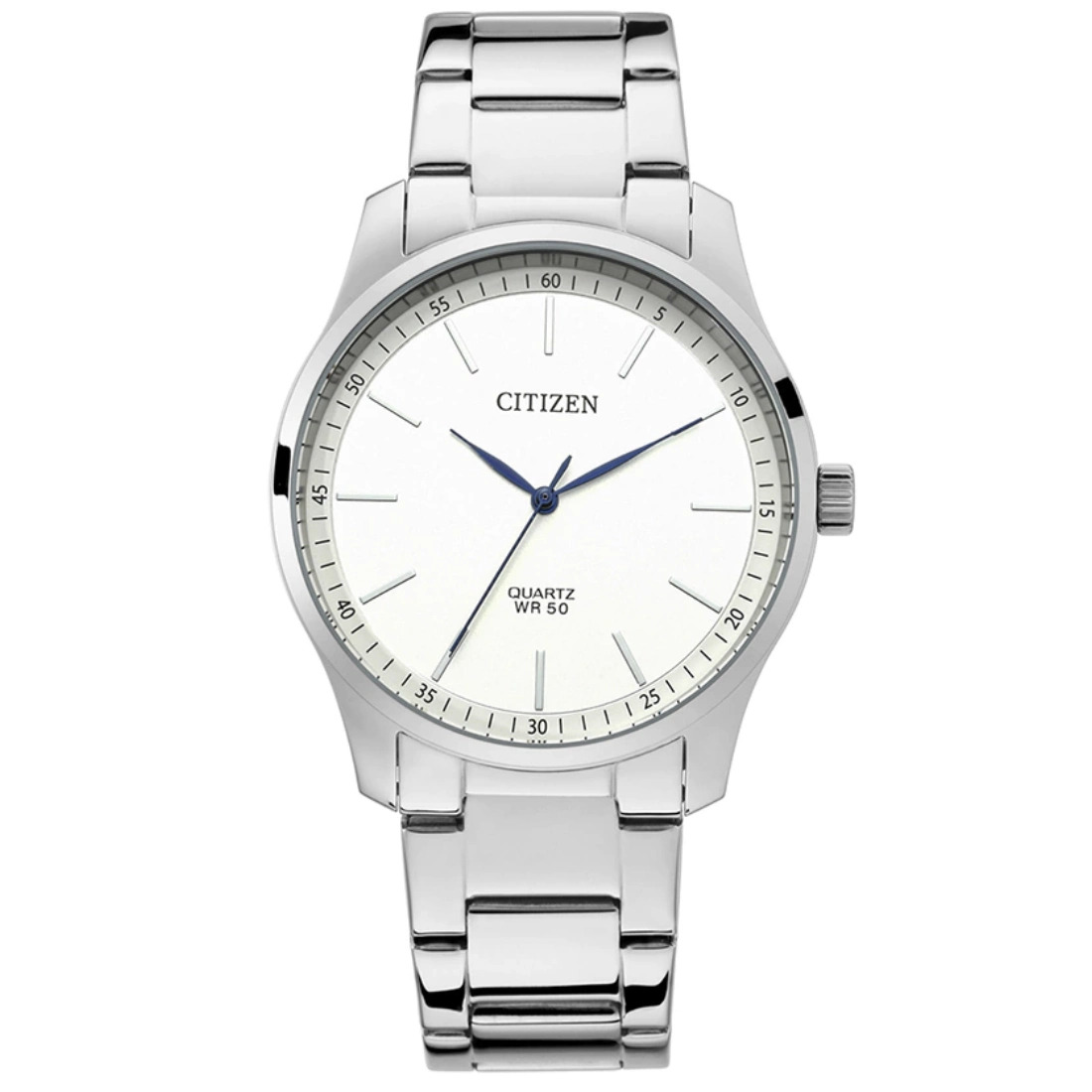 Un clásico reloj de cuarzo de CITIZEN con diseño limpio que combina en cualquier ocasión. Reloj de cuarzo para caballero en caja y brazalete de acero inoxidable. Su carátula blanca luce manecillas e indicadores con una manecilla de contraste en tono azul.