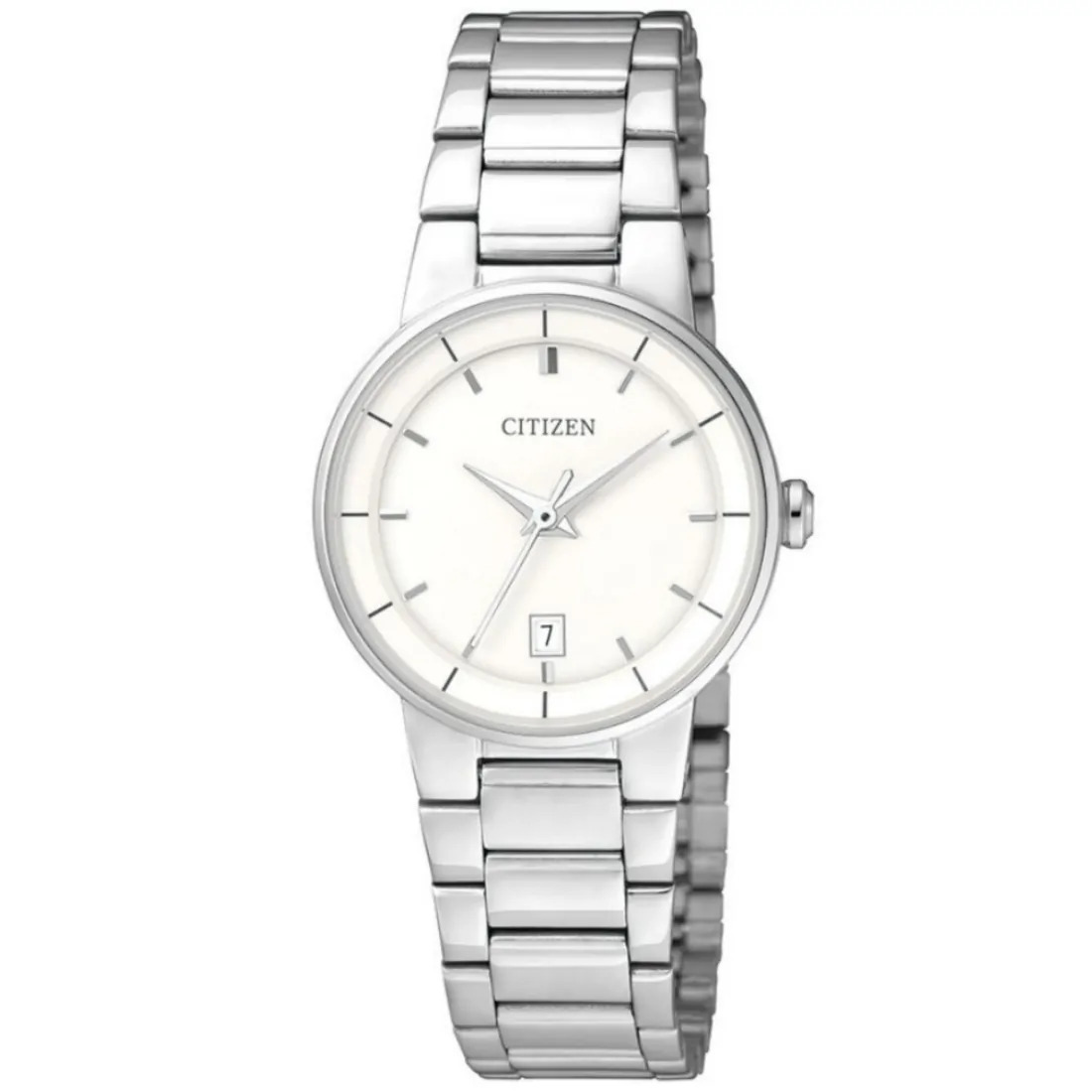 Reloj para dama de la colección de Quartz de CITIZEN®. Su elegante carátula resalta dentro de una caja y brazalete en acero inoxidable.