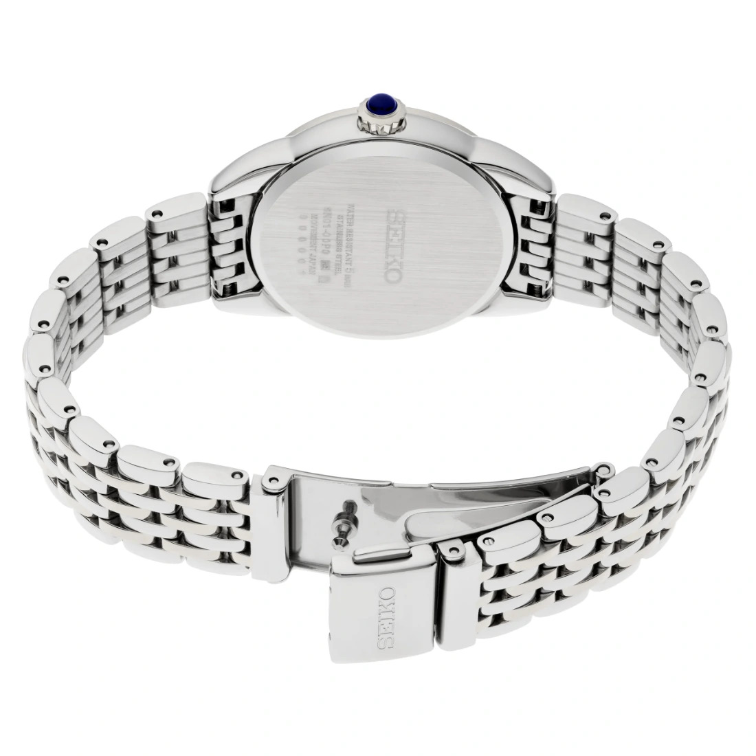 Con un elegante estilo inspirado en la joyería, este reloj, elegantemente actualizado, presenta una sofisticada esfera blanca con un sutil patrón radial central, agujas azules y números arábigos azules para una fácil lectura de la hora de un vistazo. Con una clásica corona cabujón, este diseño de equilibrio perfecto está elaborado en acero inoxidable y ofrece un cierre de botón triple.