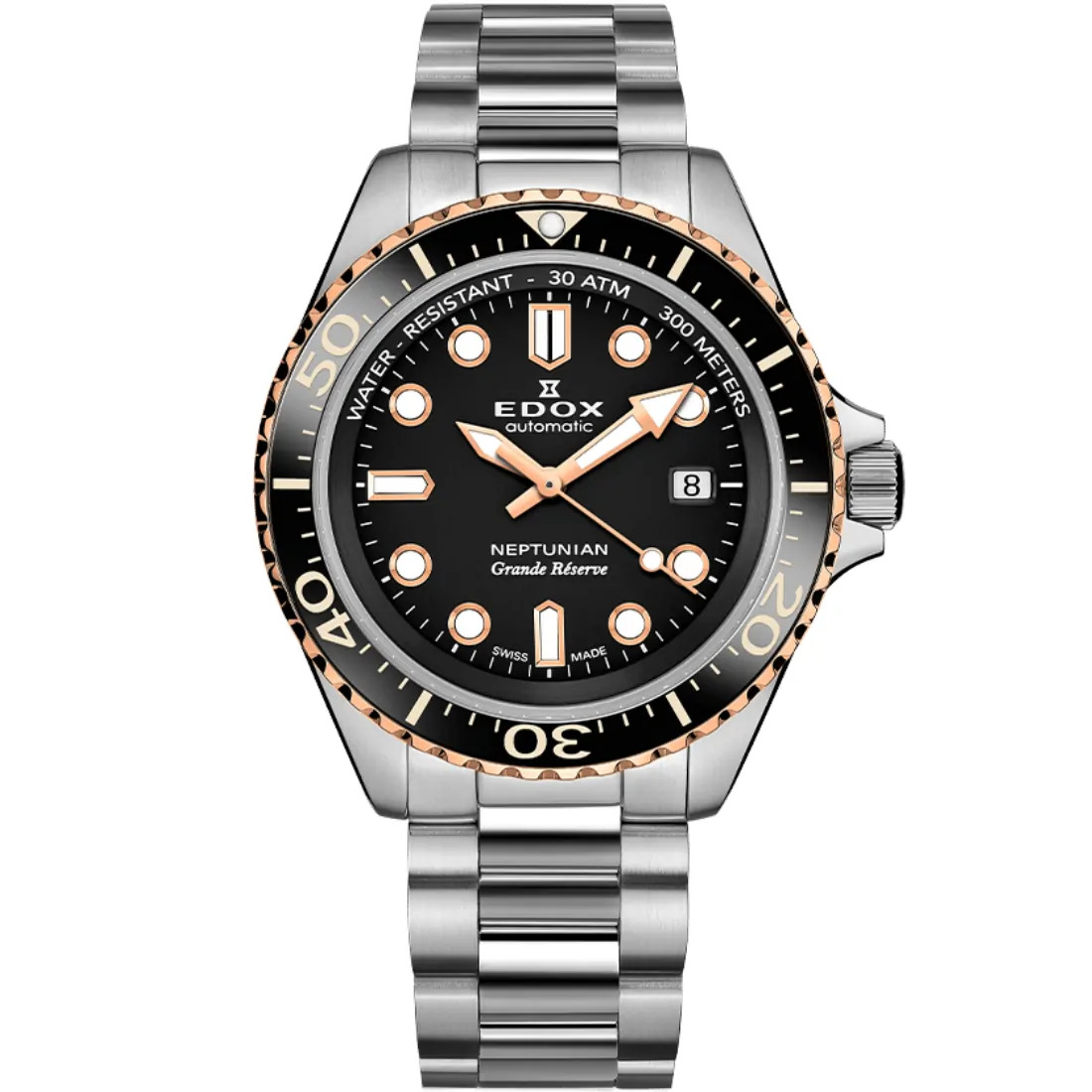 Bisel de cerámica giratorio , Corona de rosca , Corona Edox y/o pulsador con doble cierre (sistema O´ring) , Superluminova X1 en manecillas y/o índices