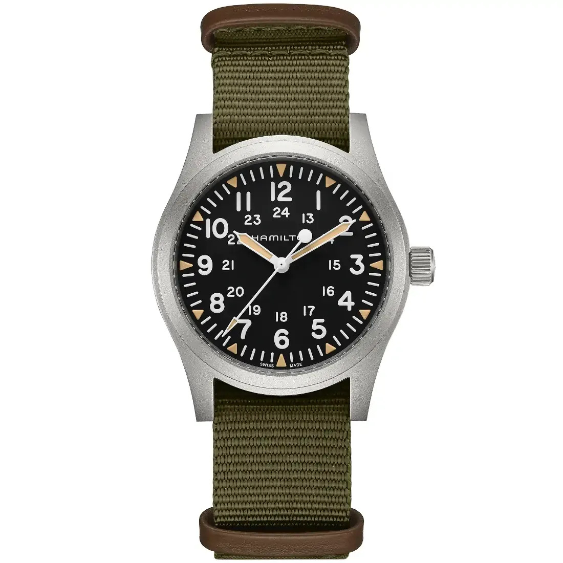 Uno de los relojes más icónicos de Hamilton está ya disponible con una caja de mayor tamaño. El Khaki Field Mechanical 42 mm, equipado con nuestro exclusivo movimiento H-50 de cuerda manual, conserva su forma con una caja de acero inoxidable con acabado arenado y una esfera ultralegible blanca o negra. El diseño robusto y resistente de esta versión renovada del reloj de soldado original le permitirá ser puntual en cualquier aventura, tanto si opta por un cómodo brazalete de acero inoxidable como por una correa NATO de tejido verde.