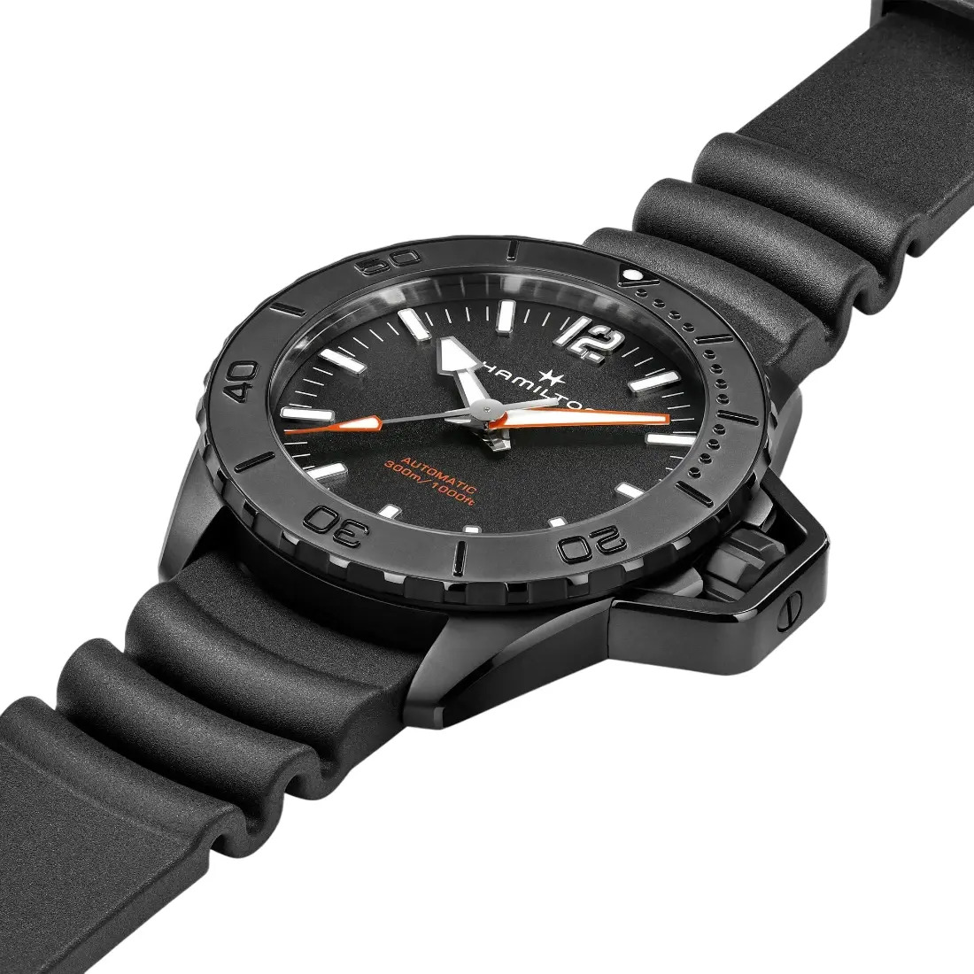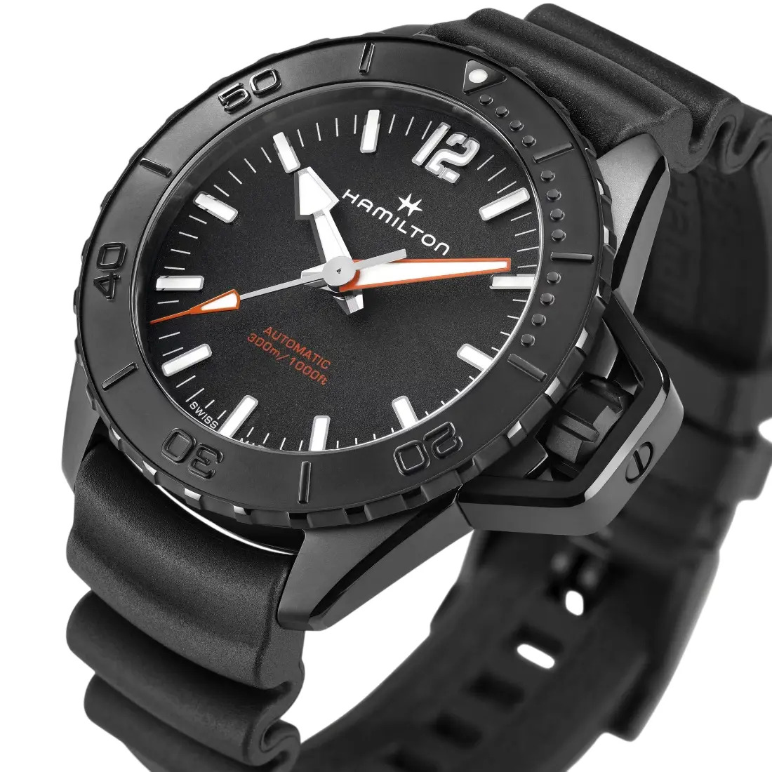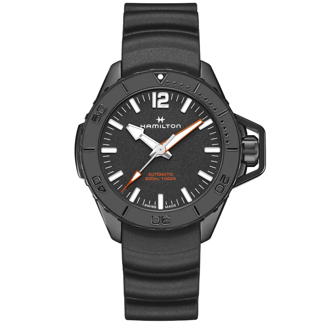 Con un diseño renovado y audaz, el Khaki Navy Frogman Automatic es el reloj de Hamilton con mejor capacidad técnica y listo para el mar. Diseñado para ofrecer precisión, legilibilidad y resistencia, este instrumento de alta precisión lleva la imponente fuerza del océano a la muñeca con un exclusivo protector de corona y una correa de caucho con aspecto de ola. Para aventuras bajo el agua.