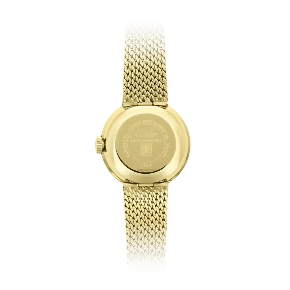 Cristal: Cristal acrílico Material de la caja: Acero inoxidable con tratamiento PVD oro amarillo Grueso (mm): 10.5 Forma de la caja: Redondo Anchura: 23.50 Longitud: 23.50