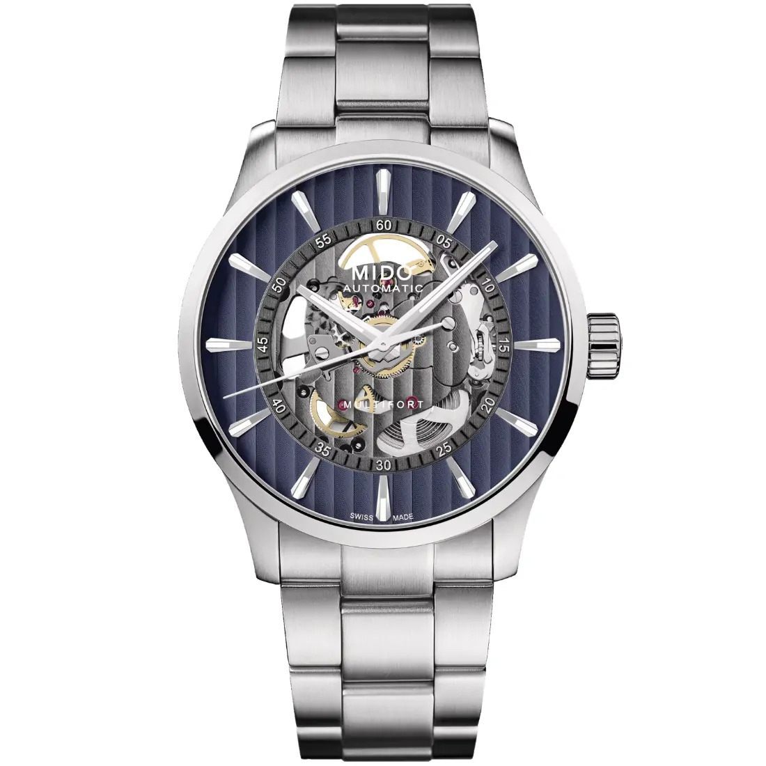 Urbano_ Extremo y Preciso. Con su estética asertiva y su mecanismo visible_ el reloj suizo Multifort Skeleton Vertigo adopta una postura audaz. En un verdadero logro estilístico y tecnológico_ MIDO muestra el corazón de su movimiento automático al revelar finalmente su carátula esqueletada. El reloj deportivo muestra una fuerte influencia arquitectónica_ una característica de esta colección inspirada en el puente del puerto de Sydney_ con barras de Ginebra que adornan su cara única.