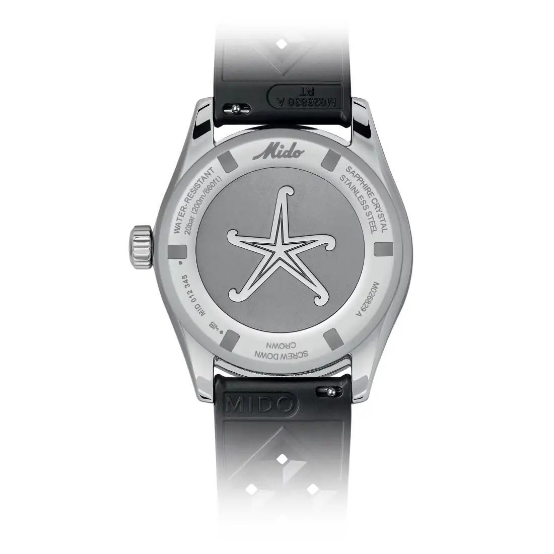 Estilo neo-vintage irresistible_ colores brillantes y tecnología de vanguardia: el nuevo Worldtimer de descompresión de Ocean Star conserva este encanto vintage y la adición de una pantalla horaria adicional lo impulsa hacia nuevos horizontes. Mido ha utilizado las últimas tecnologías en su búsqueda continua de excelencia: Super-LuminOva®_ un cristal de zafiro de estilo Glassbox_ el formidable Calibre 80 con la función Nivachron  Balance-Spring y GMT_ así como una correa adicional de cambio fácil. Una estrella de mar está grabada en la caja de atornillado de este nuevo modelo.